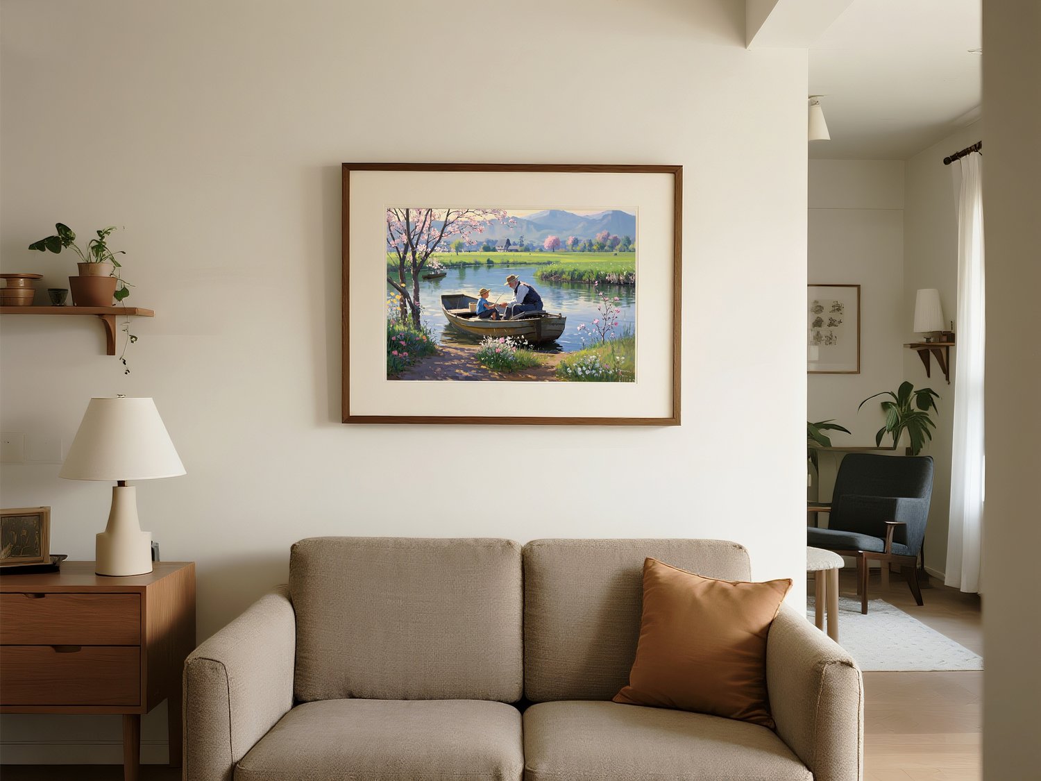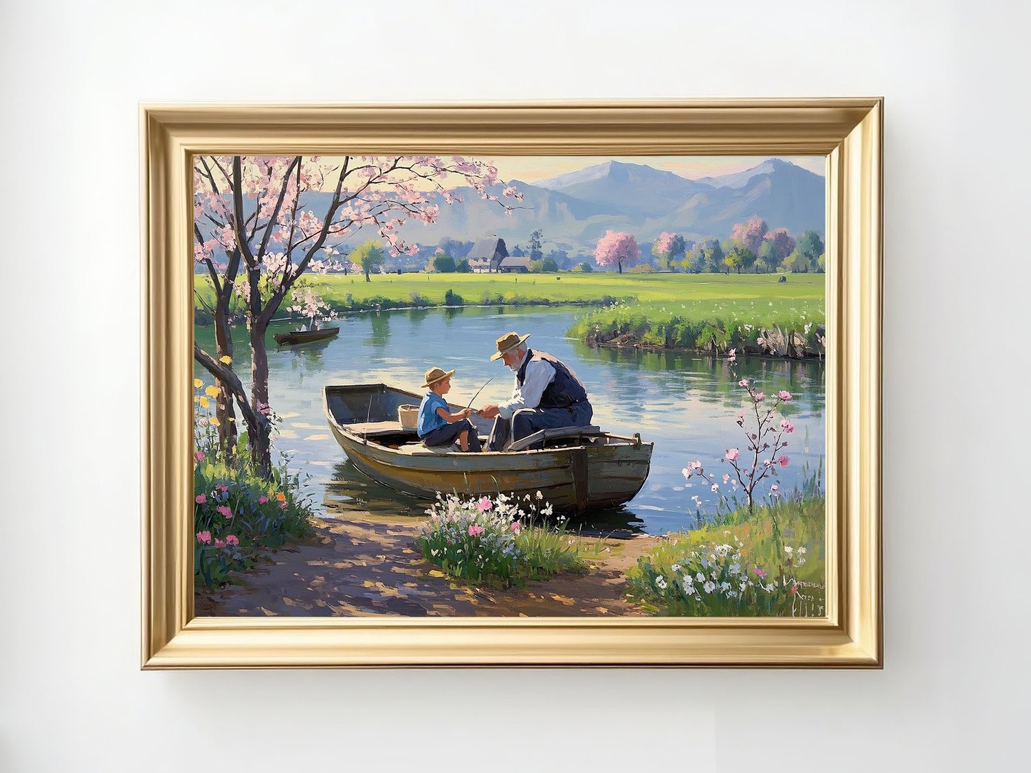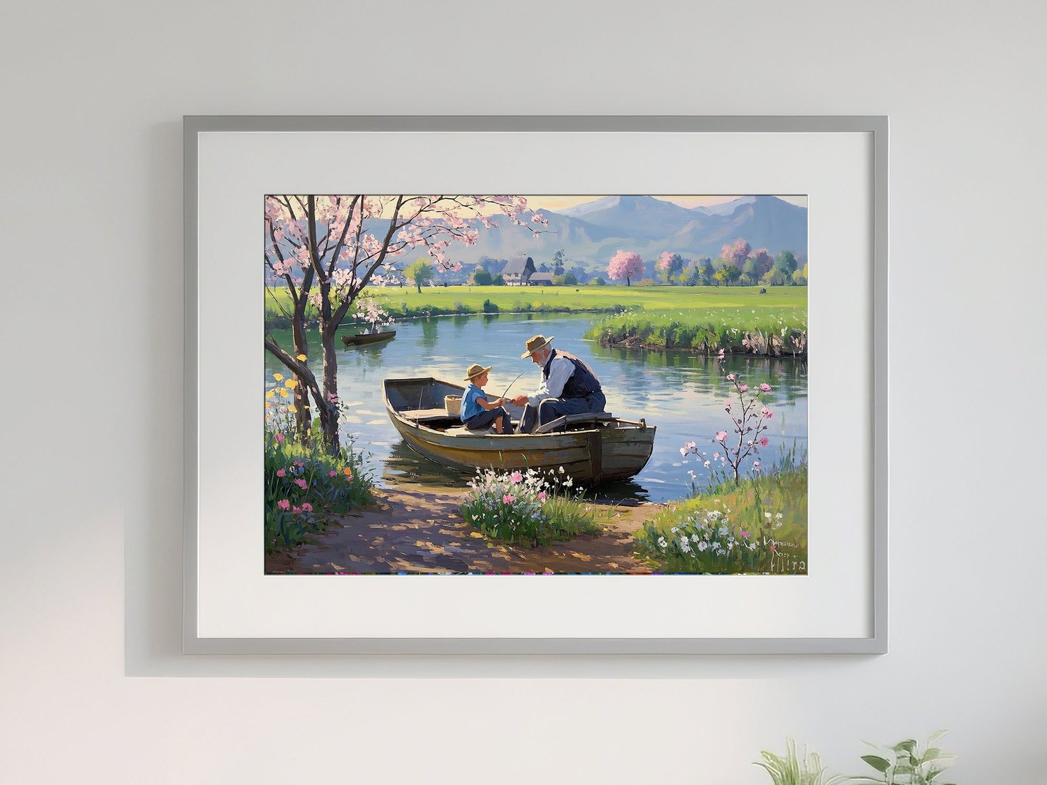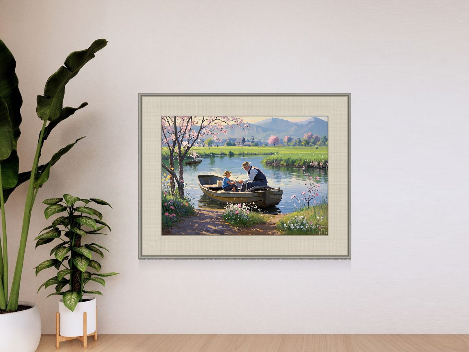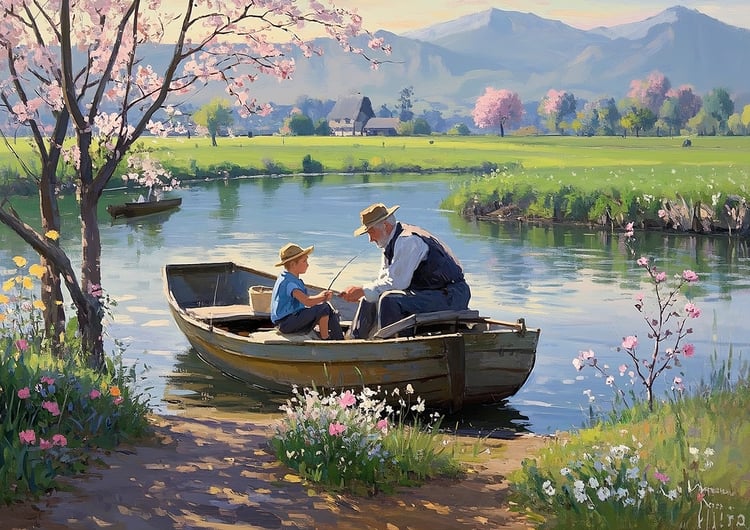 This artwork beautifully captures the serenity of spring and the warmth of human connection. The cherry blossoms and wildflowers in the foreground, along with the distant mountains, add depth and richness to the composition. What stands out most is the tender scene of a grandfather and grandson in a boat, sharing a quiet fishing moment. Their interaction conveys a sense of intergenerational bond and the gentle passing of knowledge. The use of light is soft and inviting, evoking nostalgia and comfort. Overall, it is a pastoral and heartwarming piece that offers peace and reflection to the viewer.