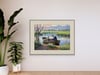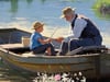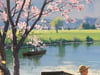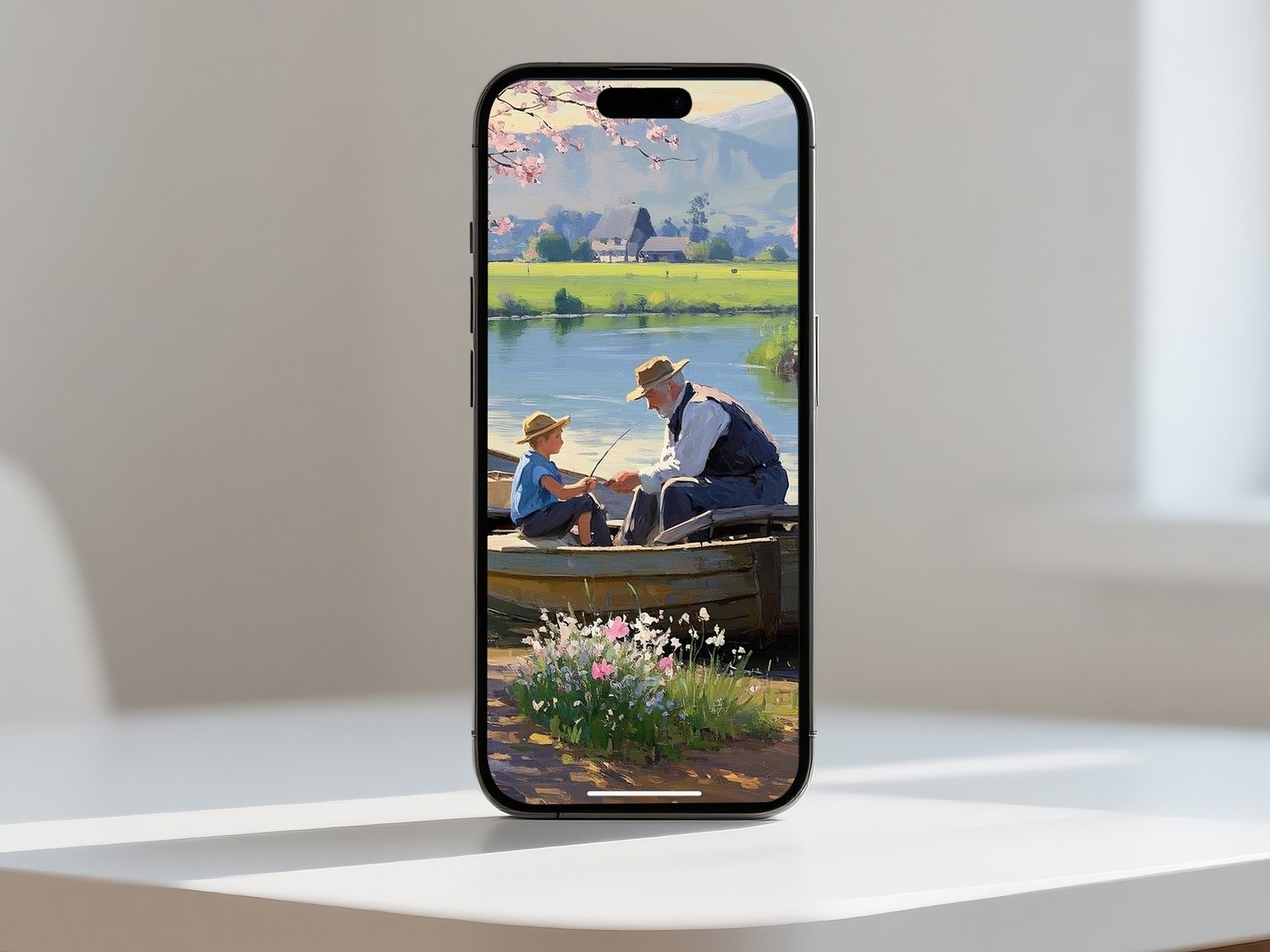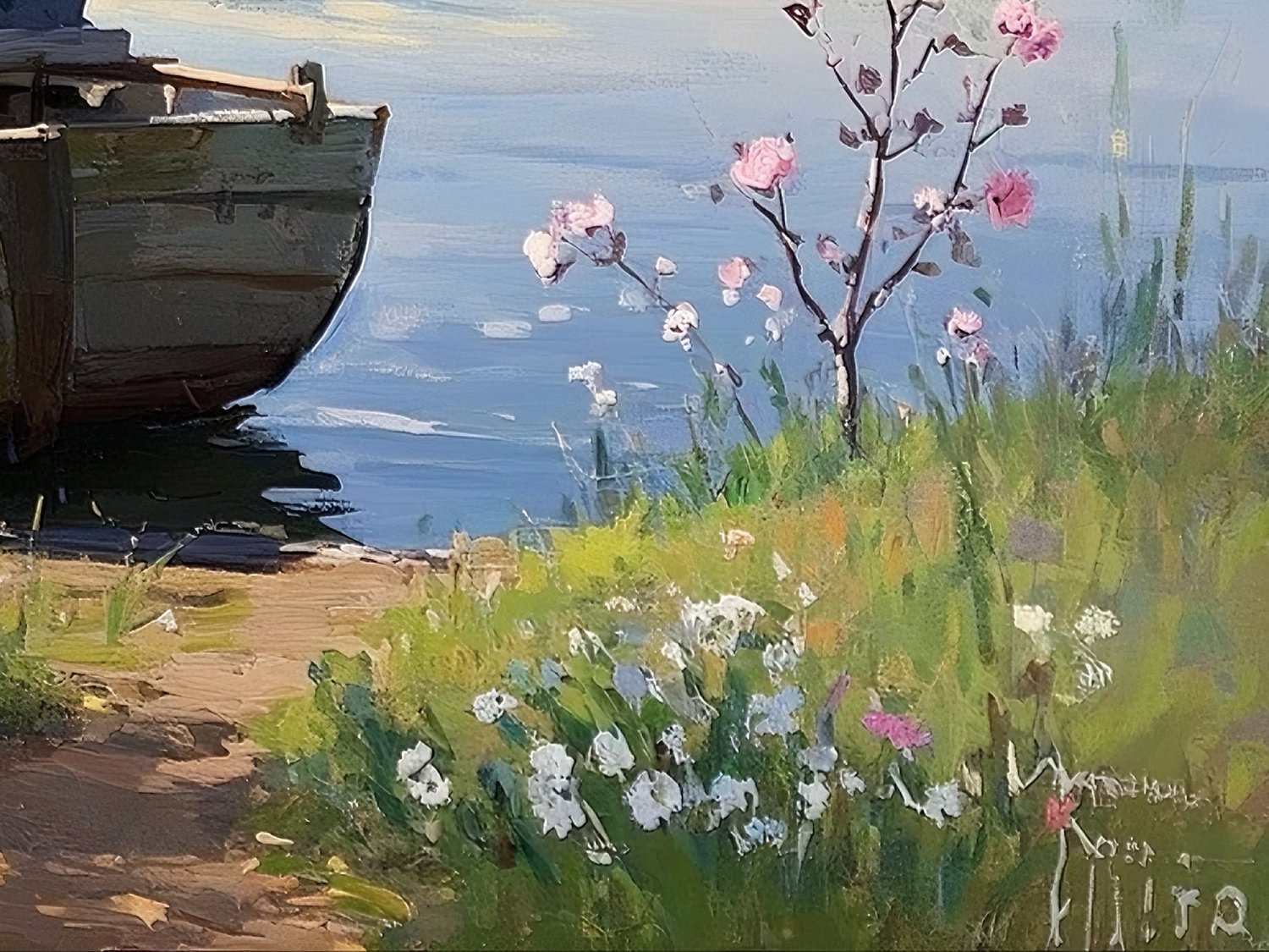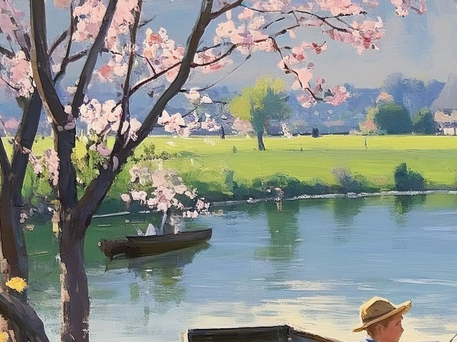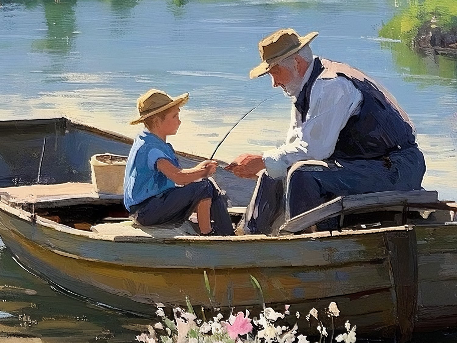 This artwork beautifully captures the serenity of spring and the warmth of human connection. The cherry blossoms and wildflowers in the foreground, along with the distant mountains, add depth and richness to the composition. What stands out most is the tender scene of a grandfather and grandson in a boat, sharing a quiet fishing moment. Their interaction conveys a sense of intergenerational bond and the gentle passing of knowledge. The use of light is soft and inviting, evoking nostalgia and comfort. Overall, it is a pastoral and heartwarming piece that offers peace and reflection to the viewer.