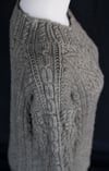 This sweater began as a “what if” exercise. What if I had designed an Aran sweater for my Master Knitter Level 3 sweater instead of a Fair Isle one? With that in mind, I set out to design this sweater (minus the bobble requirement!), which is a simple, traditional drop-shoulder silhouette, with saddle shoulders. This could easily be a unisex sweater! Designed to be worn with about 2-4 inches of ease, it’s an easy-to-wear pullover with a wide and comfortable neckline. The soft and scrumptious yarn ensures that it will be cozy in the winter. (I can’t wait until it’s chilly enough to wear it!)
