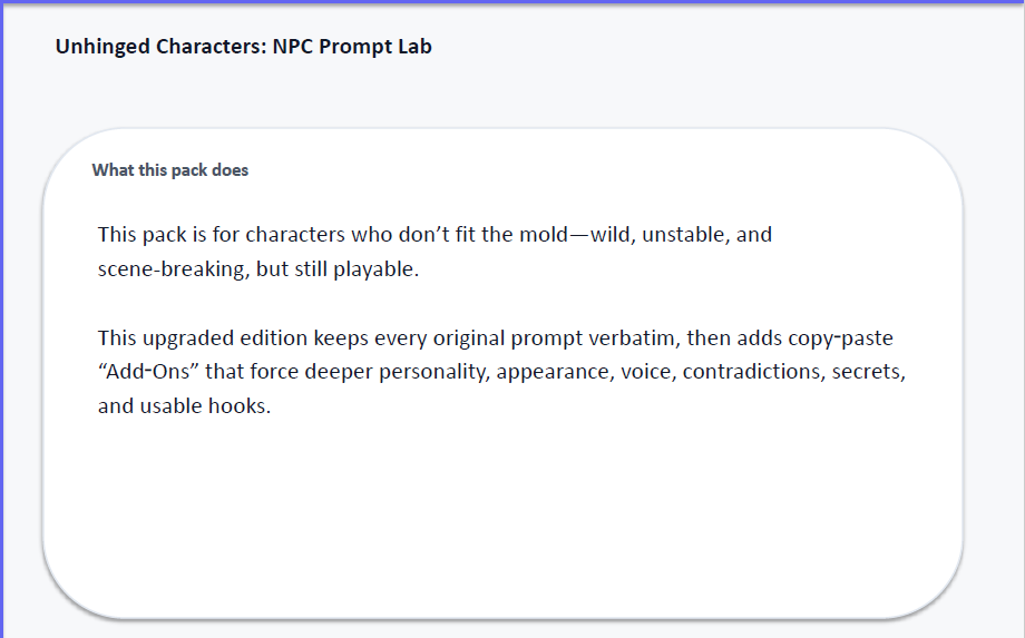 Unhinged Character Creation is a prompt pack for writers and RPG GMs who want characters that are chaotic, vivid, and story-ready — not random nonsense.