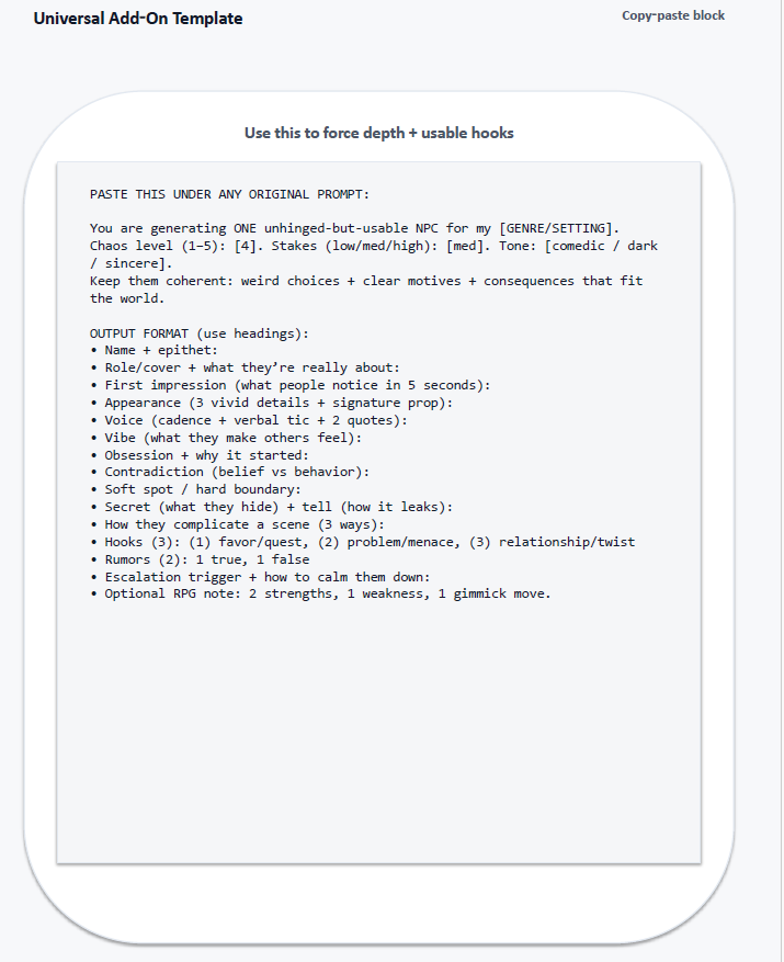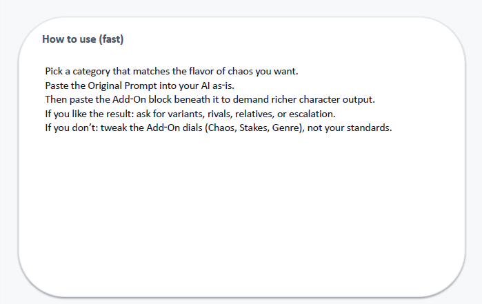 How to use: Paste a prompt into ChatGPT (or any AI), swap in your genre/world details, then ask for variations like “make them more sympathetic,” “make them more dangerous,” “make them secretly competent,” or “give me 3 versions.”
