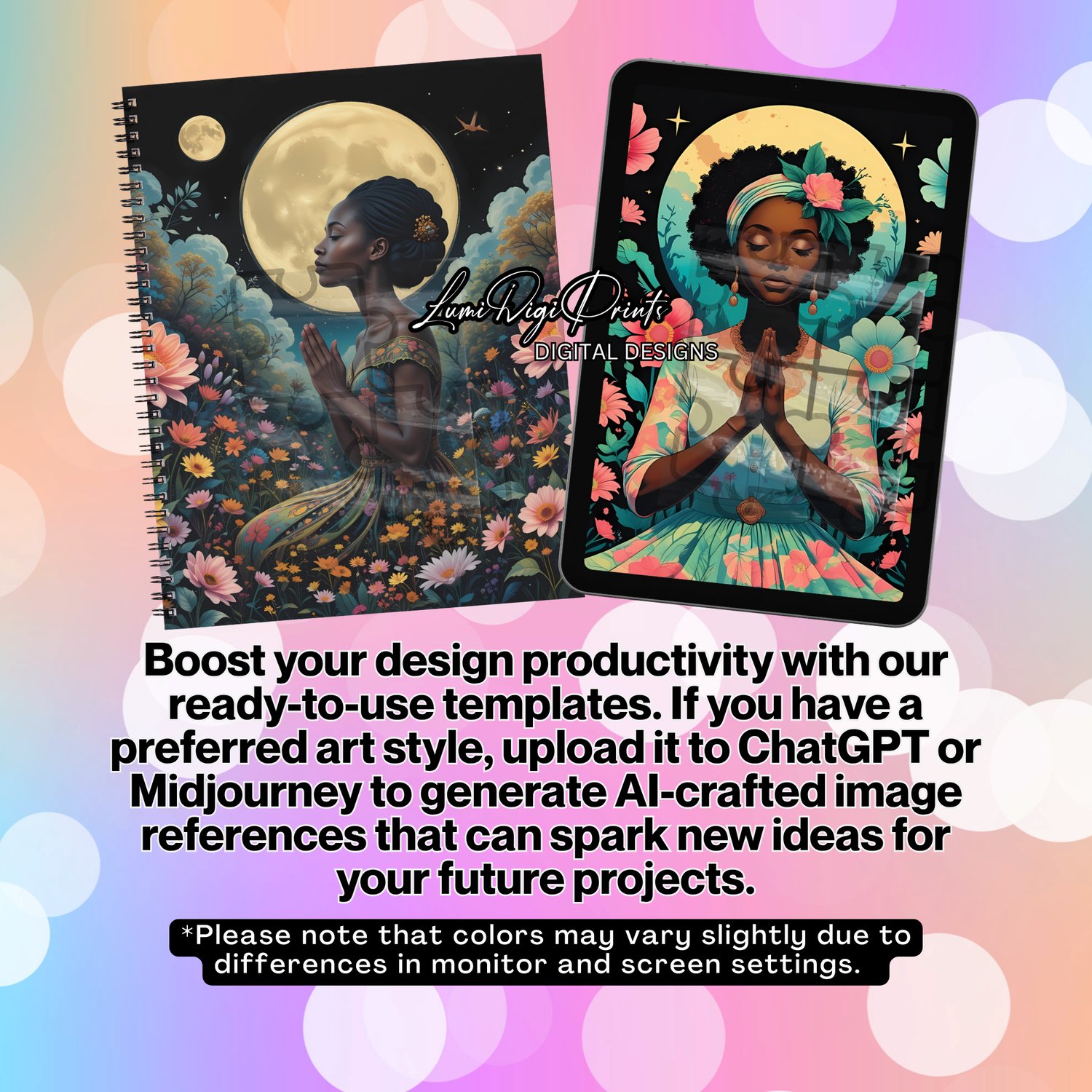 Let your pages glow with intention, reflection, and beauty. Sacred Summer Nights is a soul-stirring collection of printable journal covers featuring serene nighttime scenes of empowered Black women surrounded by blooming florals, full moons, and radiant summer energy.