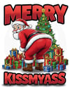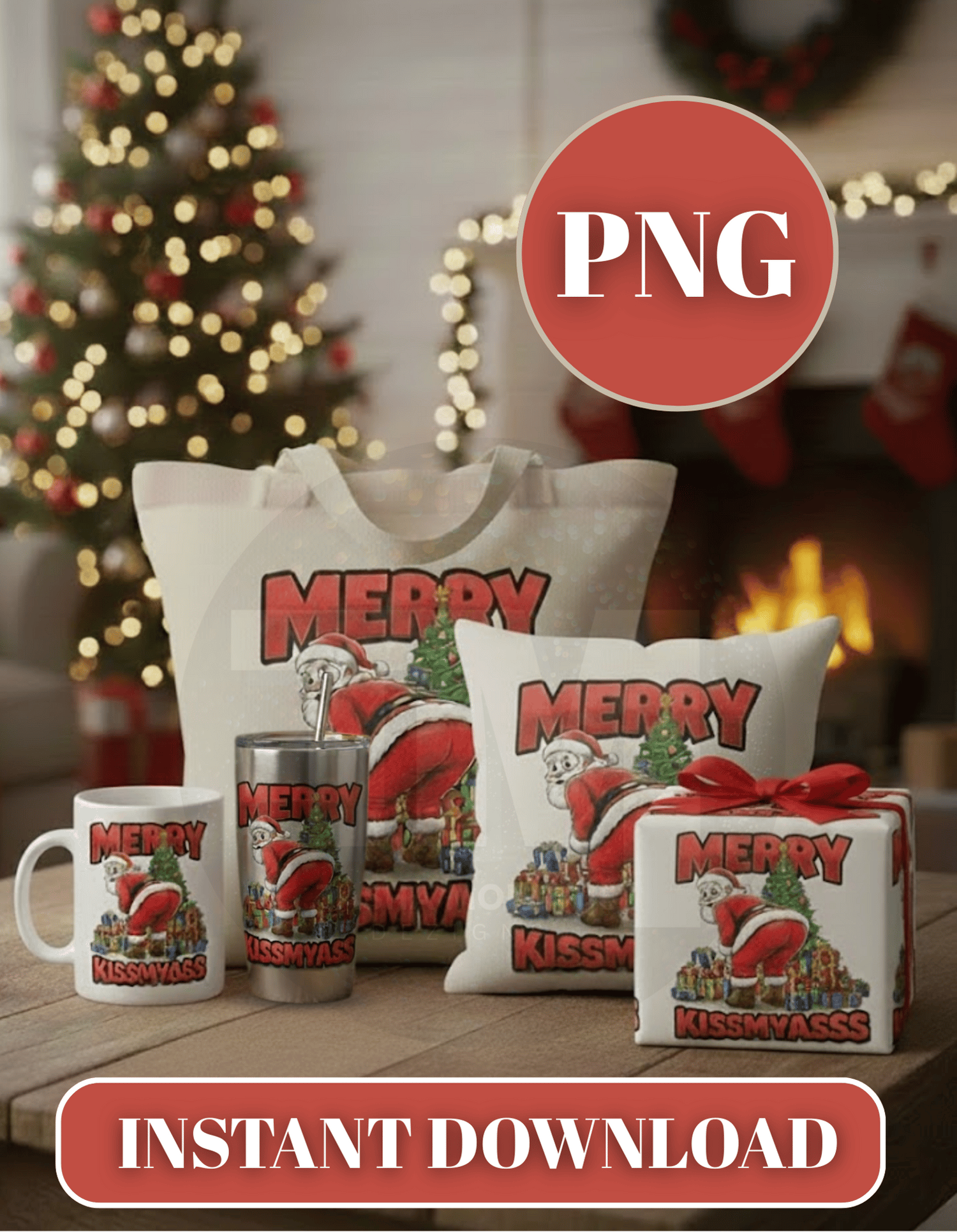 This high-resolution PNG graphic is perfect for adding adult humor to your Christmas crafts and products. Featuring a cheeky Santa Claus and bold "MERRY KISSMYASS" text, it's an instant download guaranteed to get a laugh.