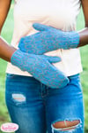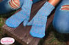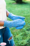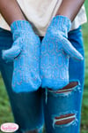 These mitts cover the whole hand, with a ribbed cuff and an afterthought thumb. They are knitted in the round using DK weight yarn, with the double thickness of the stranded fabric making them extra warm. The single size stretches well to fit hands sized 6-8” diameter, and the pattern repeats are large. There are two cuff options, and the mitts will work in a wide variety of color combinations.
