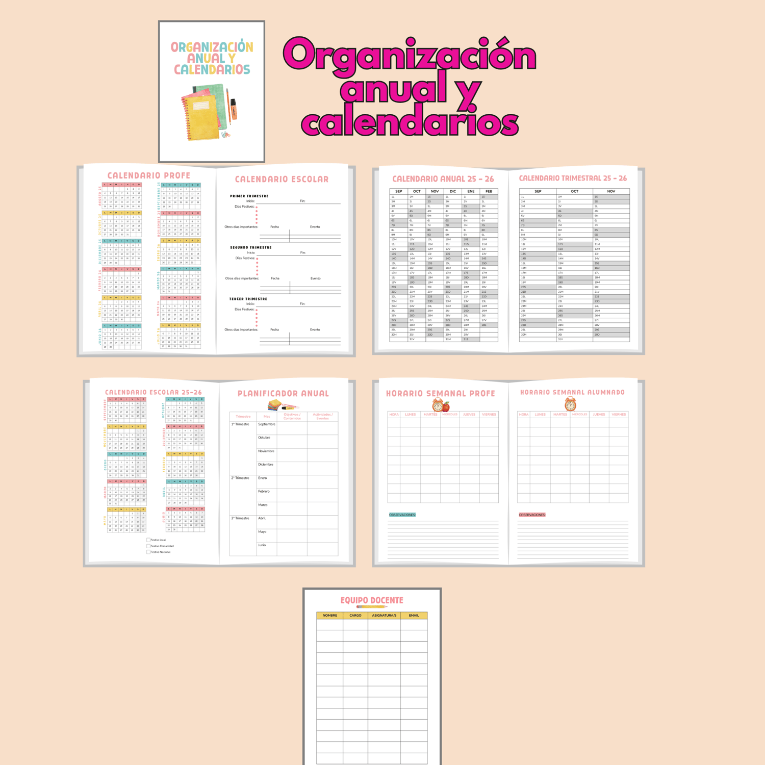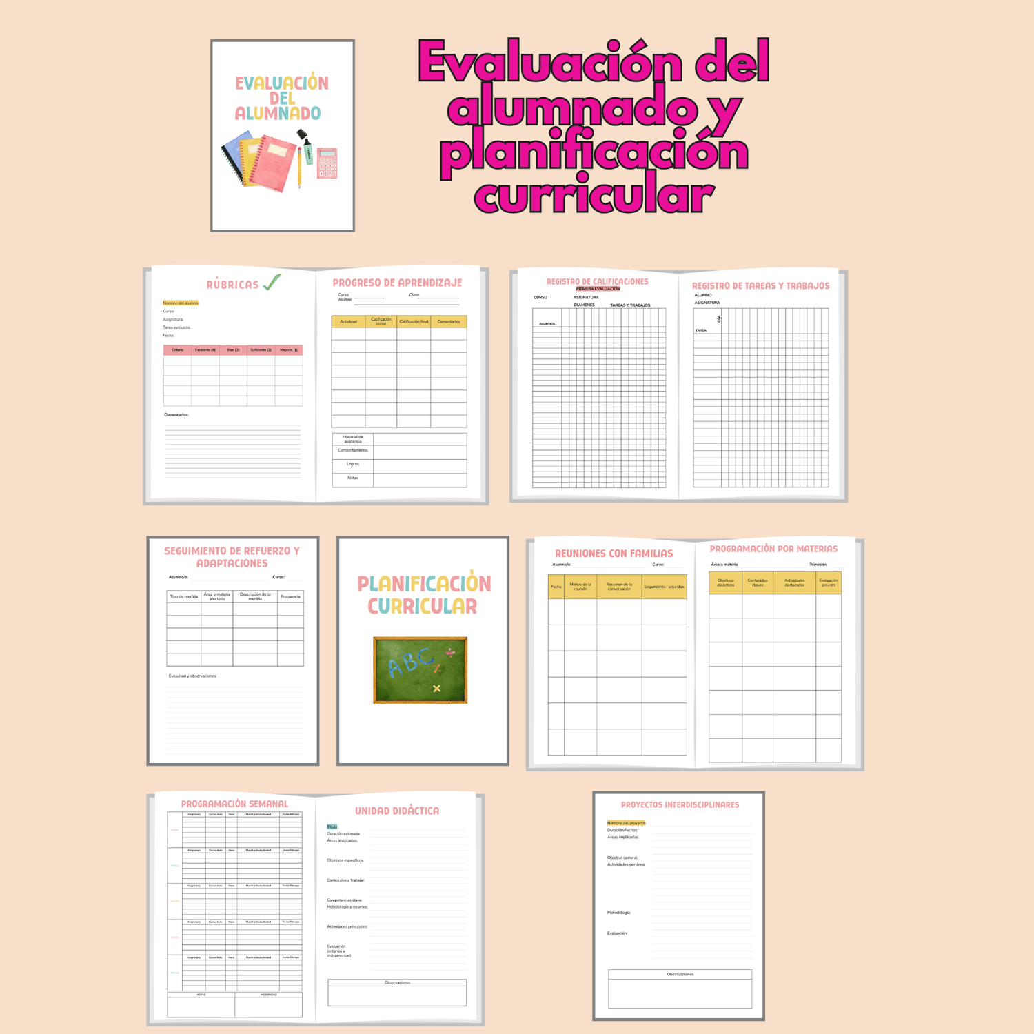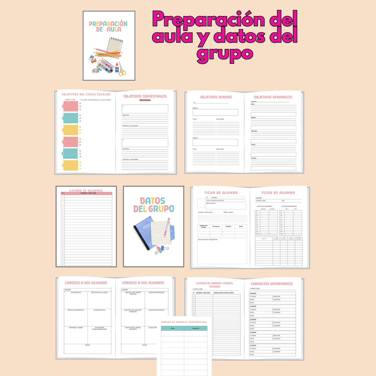 Este cuaderno escolar ha sido diseñado para docentes que buscan tenerlo TODO en un solo lugar: agenda semanal con fechas, planificación, evaluaciones, reuniones, tutorías, fichas del alumnado… ¡y mucho más!