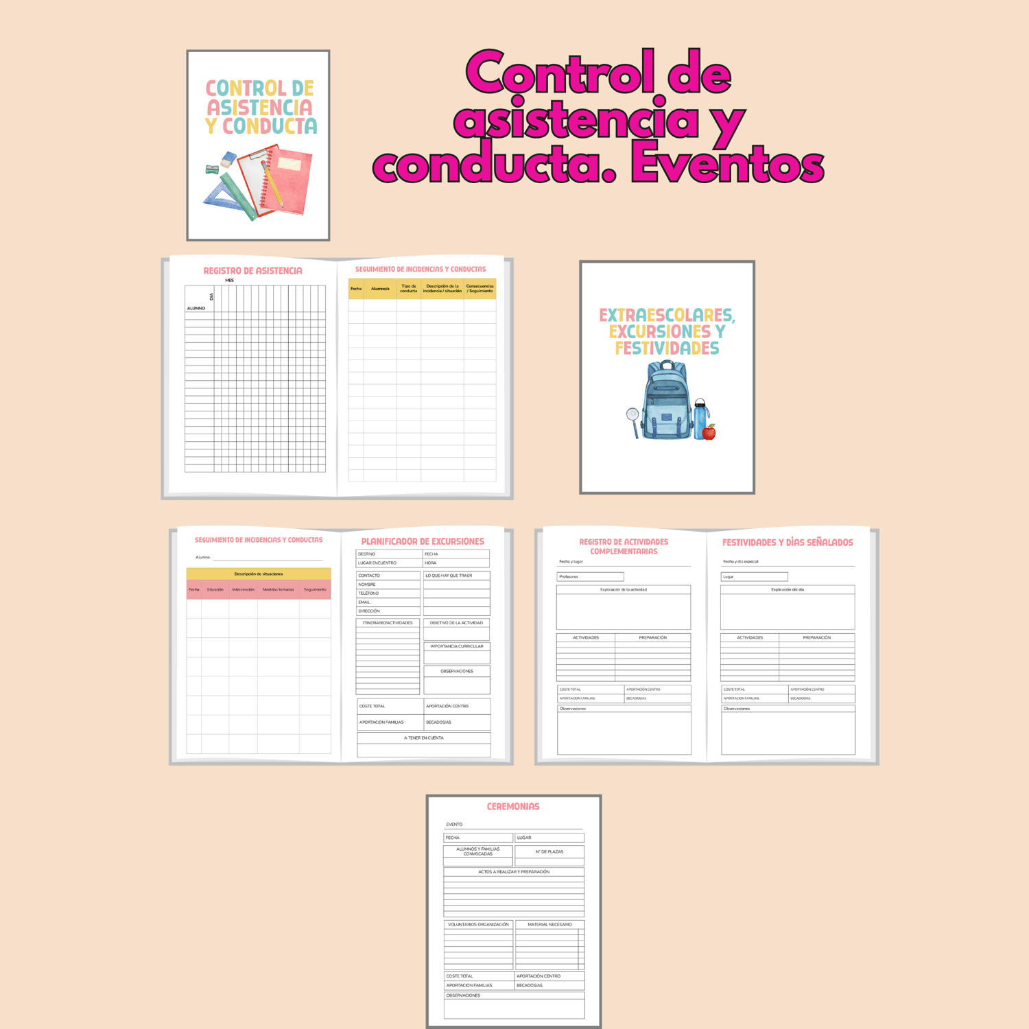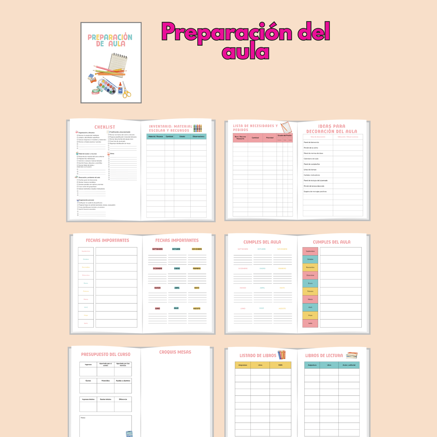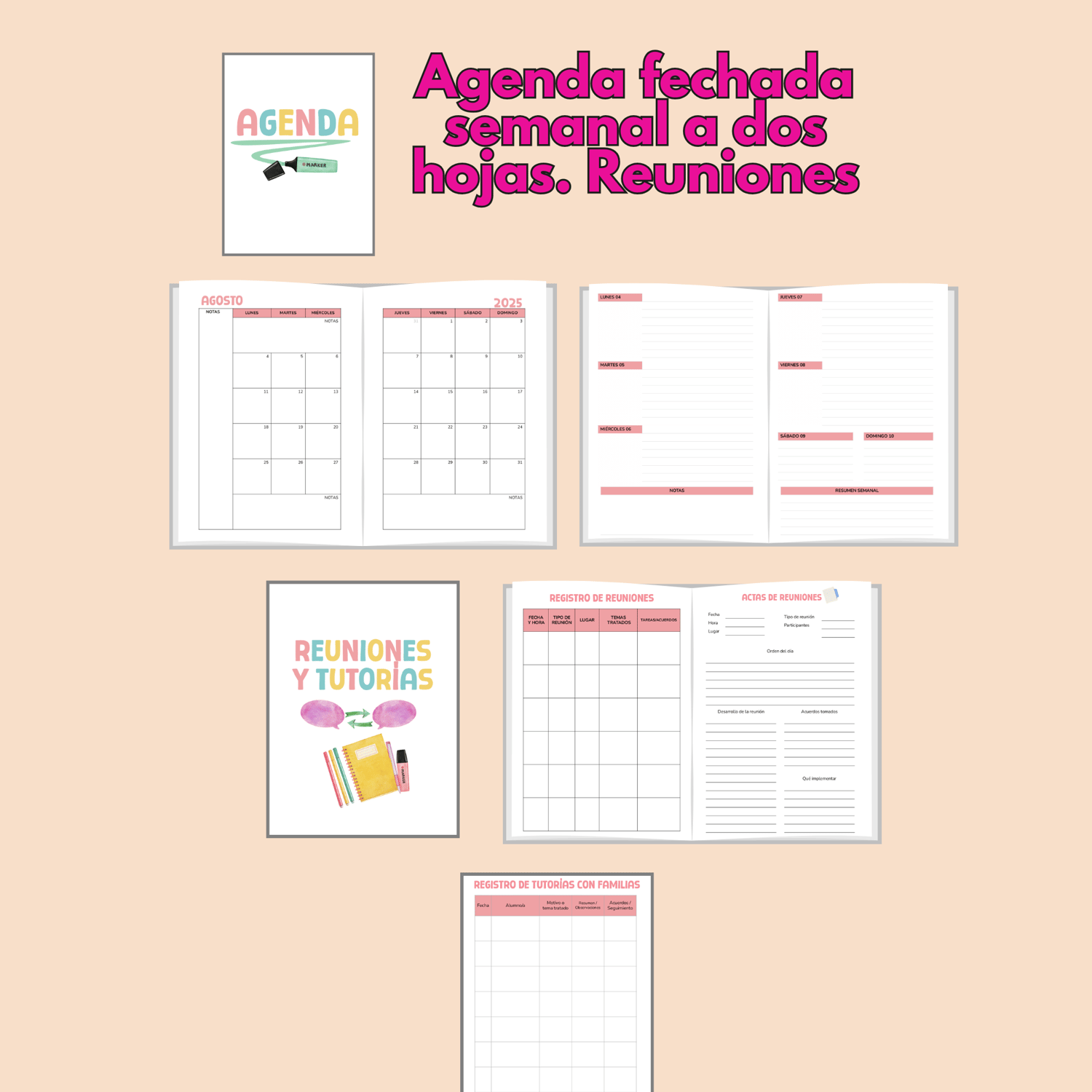 Este cuaderno escolar ha sido diseñado para docentes que buscan tenerlo TODO en un solo lugar: agenda semanal con fechas, planificación, evaluaciones, reuniones, tutorías, fichas del alumnado… ¡y mucho más!