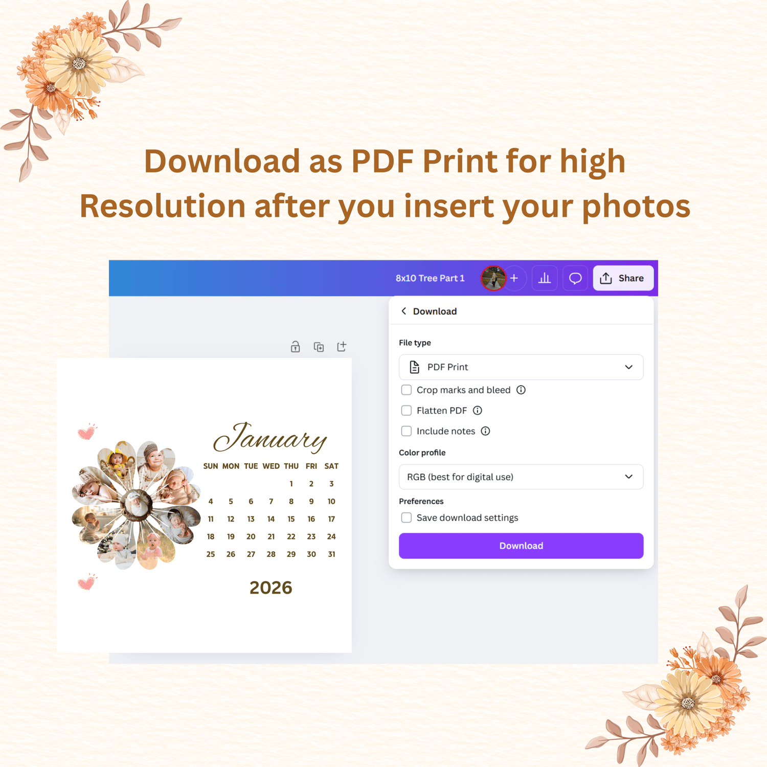 2026 Flower Photo Calendar: Printable Canva Template Digital Download Ver 2 Horizontal