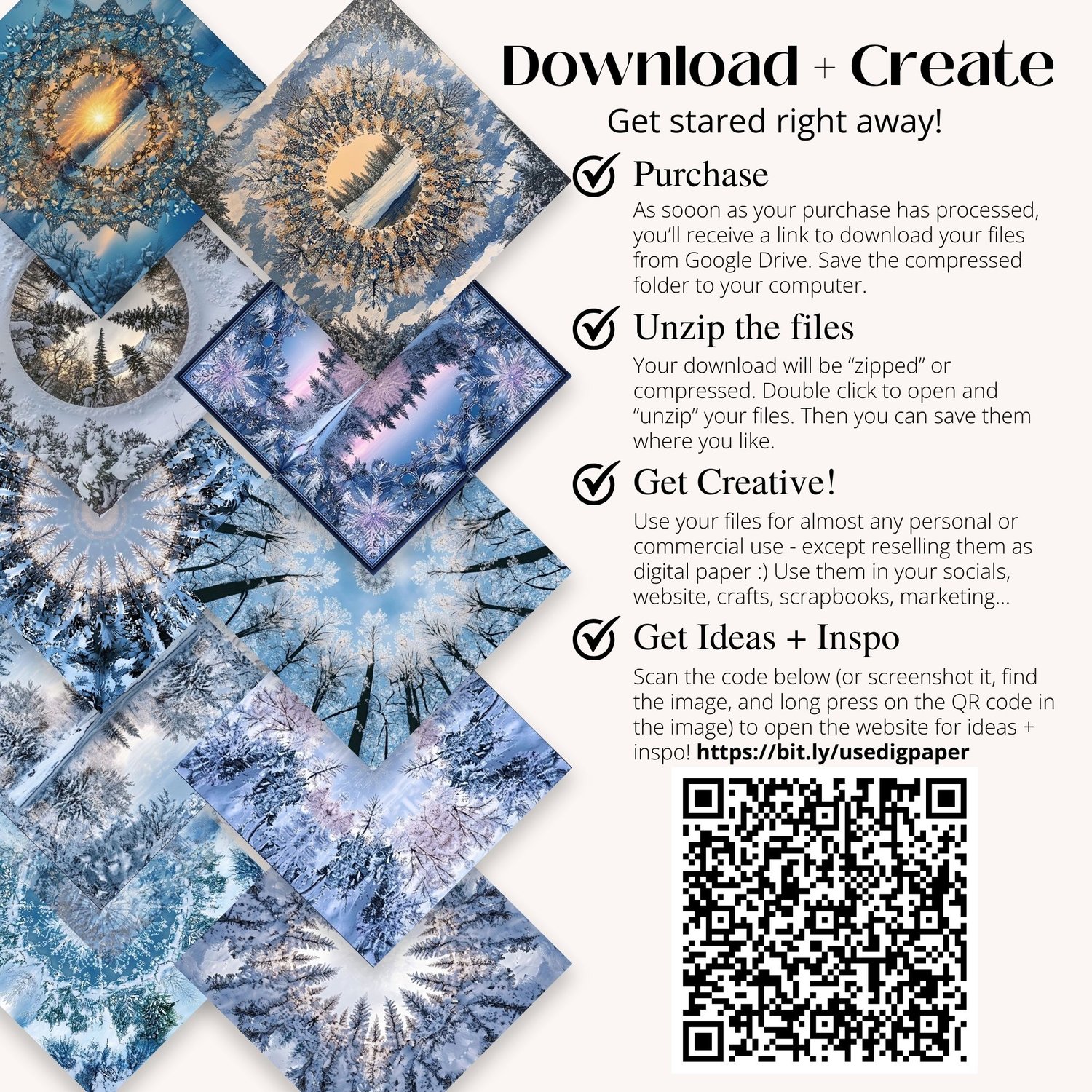 Bring a mesmerizing touch of winter to your projects with this Winter Kaleidoscope Digital Paper Set. Featuring intricate snowy scenes and icy kaleidoscope patterns, these high-resolution papers are ideal for DIY crafters, content creators, and scrapbookers looking to add a unique, frosty vibe to their winter projects. Use these designs for holiday cards, seasonal decor, social media graphics, and more to bring the beauty of winter indoors.