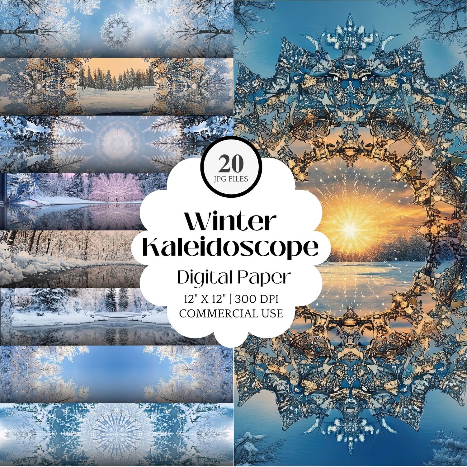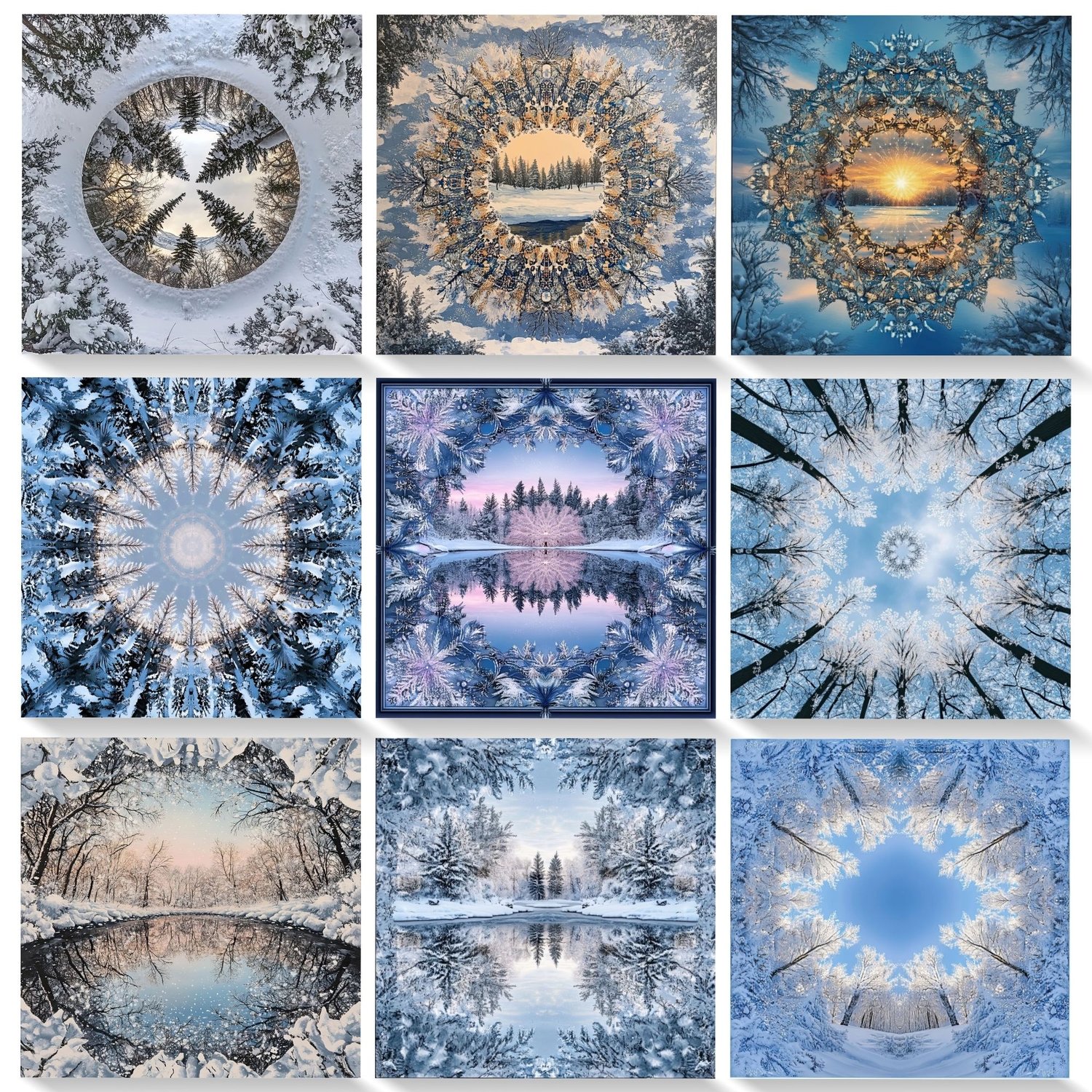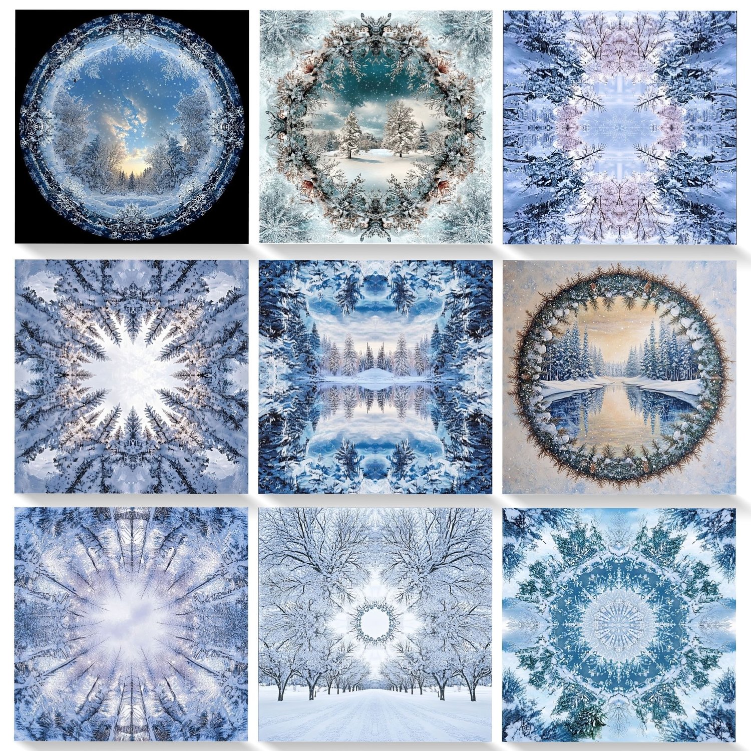 ❄️ 20 high-resolution JPG files featuring kaleidoscope-inspired winter scenes.