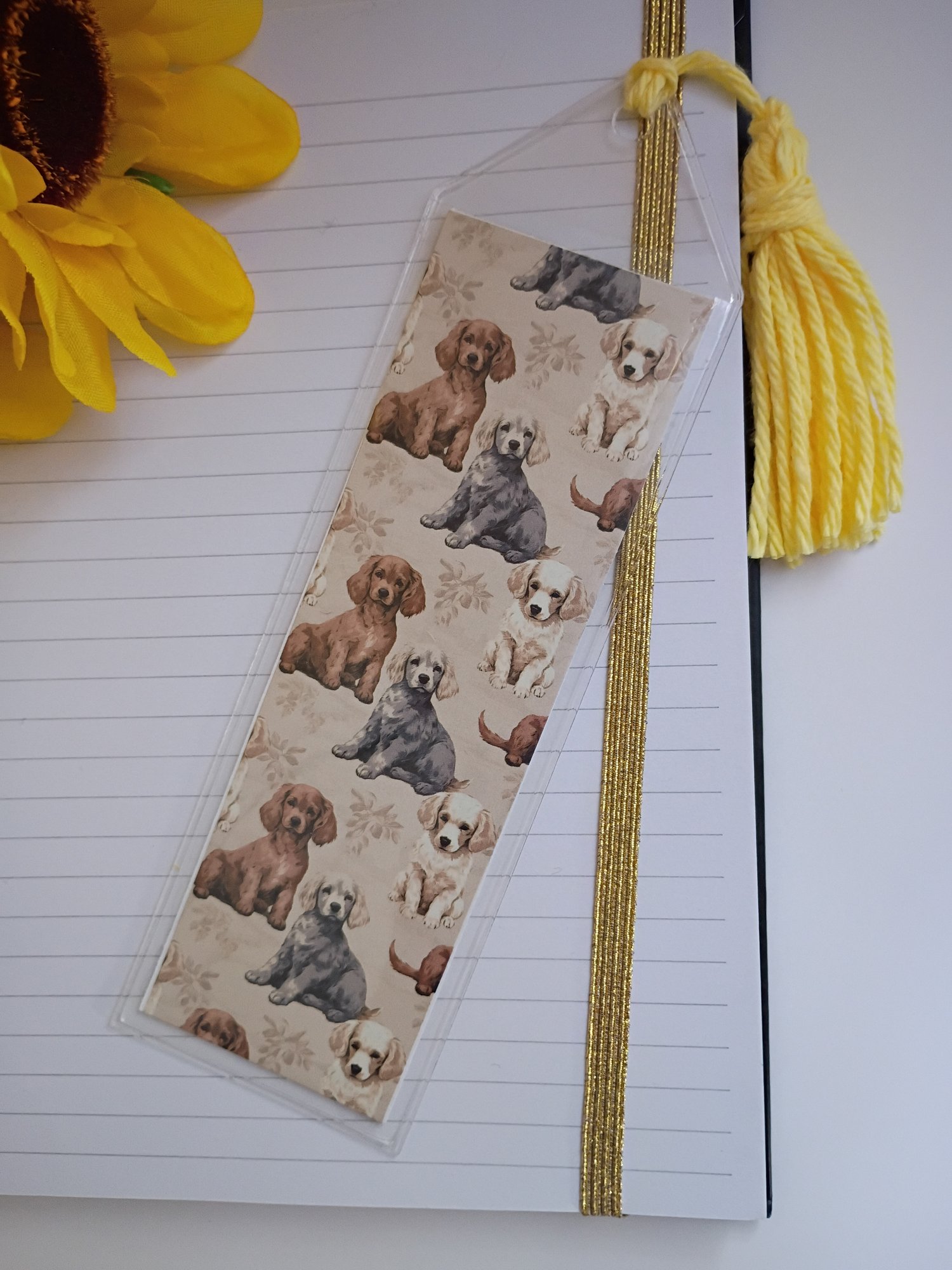 These bookmarks have a different design and pattern on the front and back. The dogs are on the front. They are made from upcycled scrapbook paper and attached to 170 lb. weight cardstock paper for extra stability and firmness.