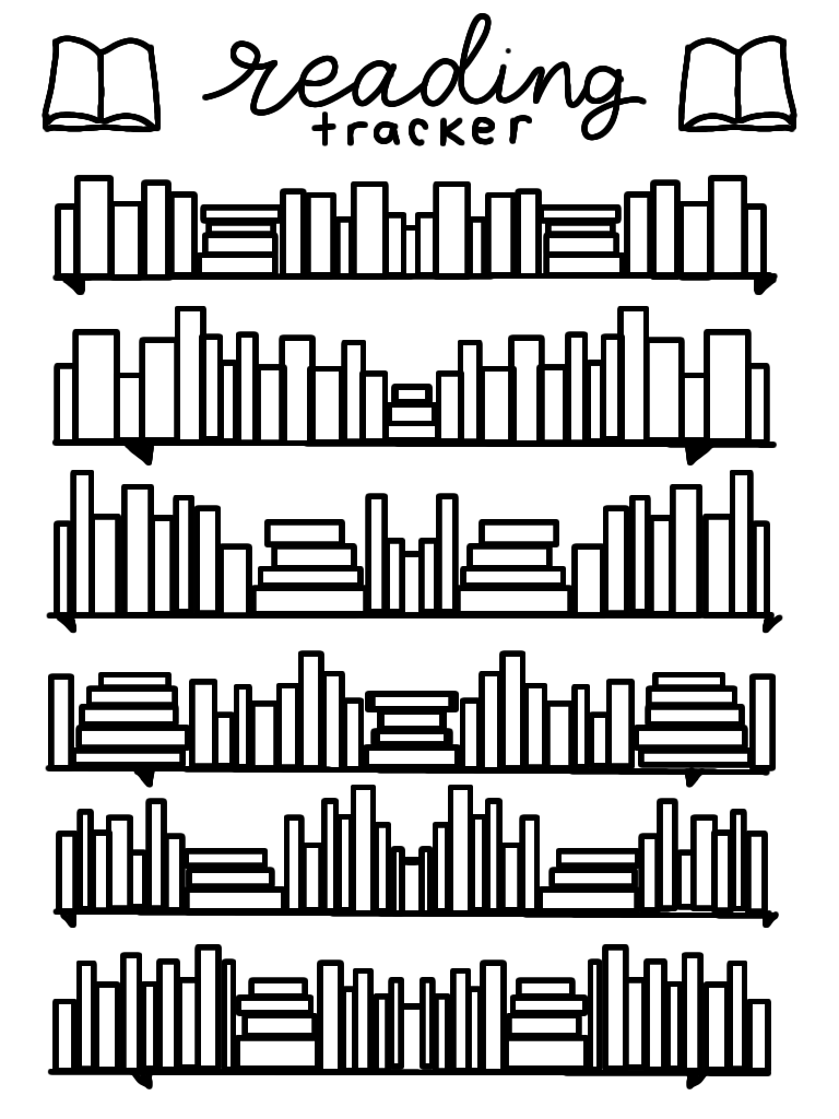 - Hand-drawn bookshelf design with spaces to write book titles or color in finished reads