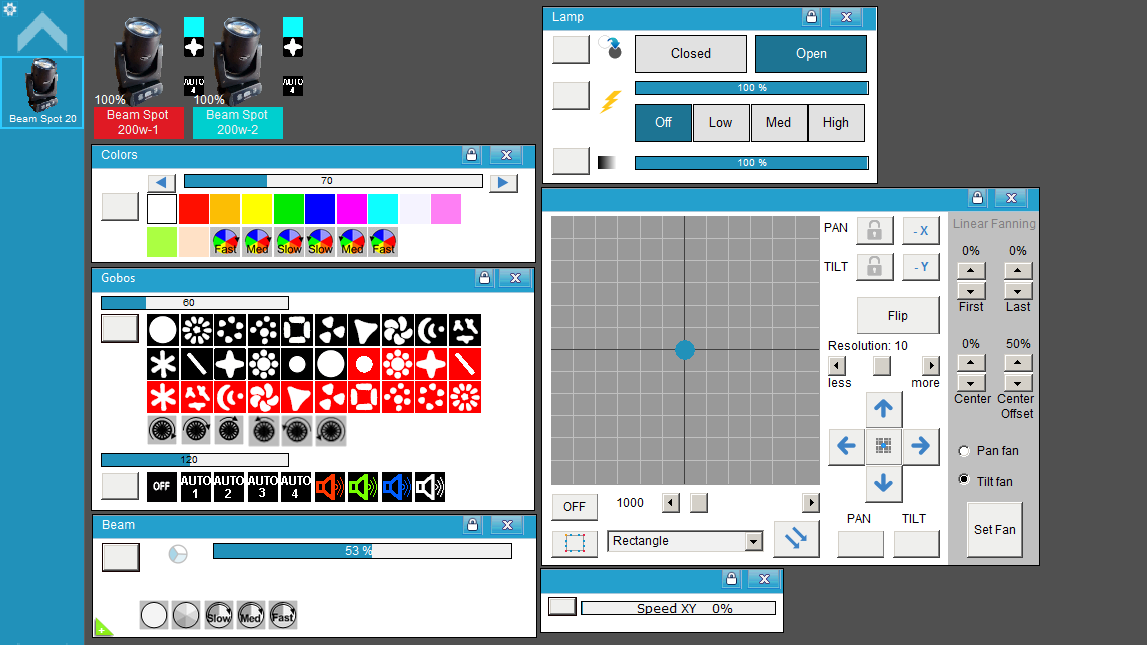 * Verifique, con un Fixture de pruebas (click), que coincidan estos canales: 6 Dimmer, 8 en el valor 40 = Color Verde, 10 Prisma, 9 en el valor 35 = Gobo de ventilador (ver tercer foto).