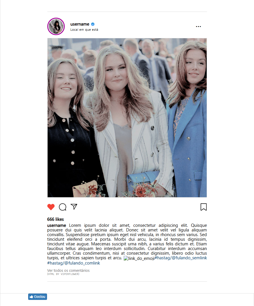 Como já diz o nome, é um HTML que simula uma postagem em feed do Instagram. Ele leva duas fotos, sendo uma para o avatar da conta e a outra, a foto a ser postada, com uma largura de 550px.
