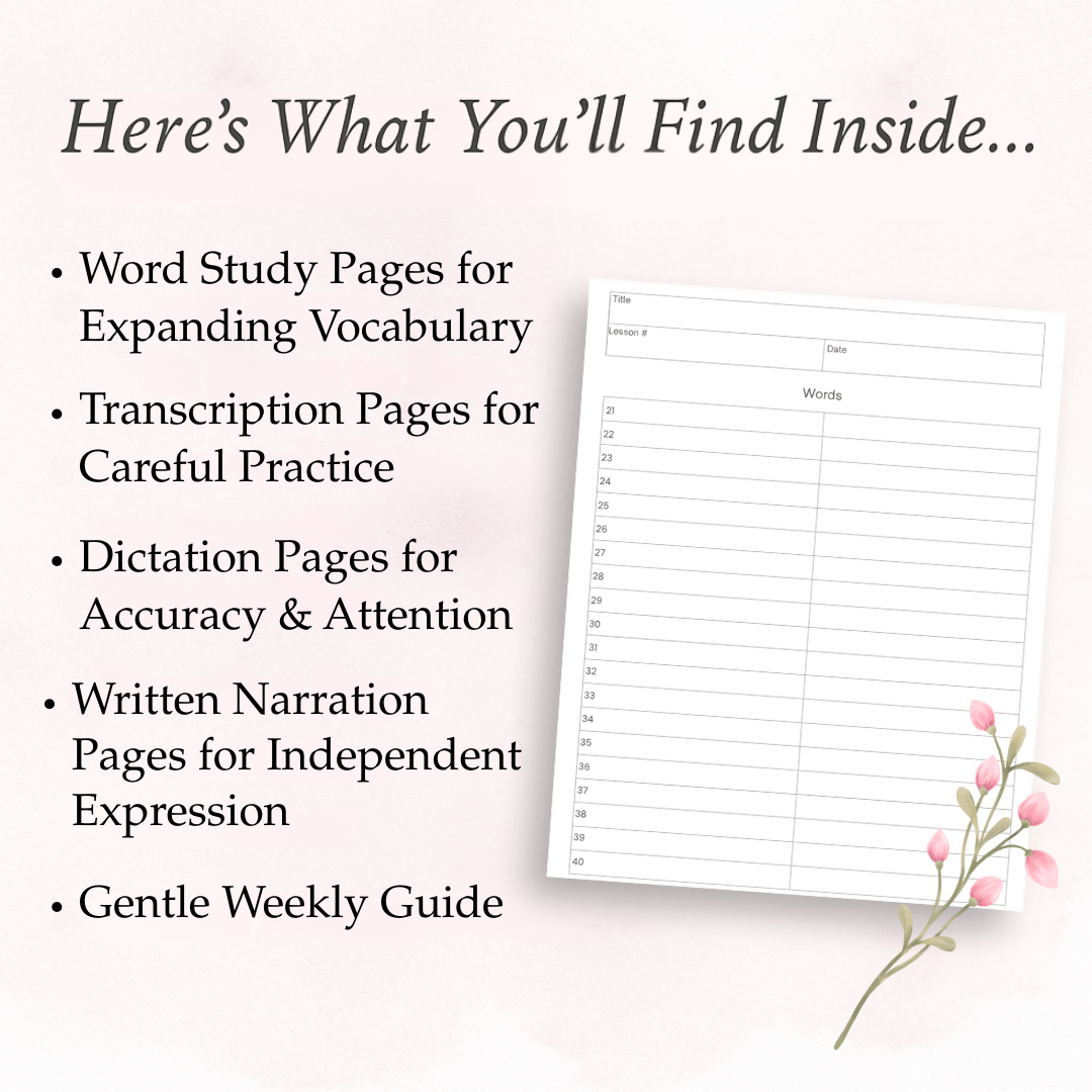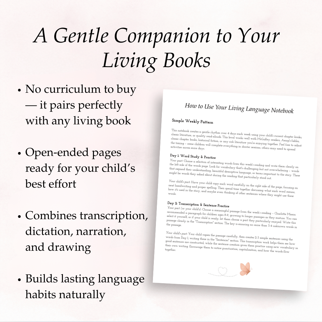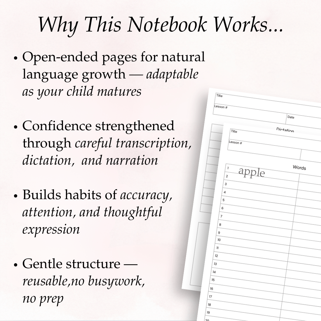 This Living Language Lessons Notebook builds on the quiet habits you’ve already nurtured through copywork and reading aloud. It gently invites your child to begin noticing how language works, while giving them a safe and thoughtful space to begin using it themselves—through transcription, simple sentence-building, and eventually written narration.