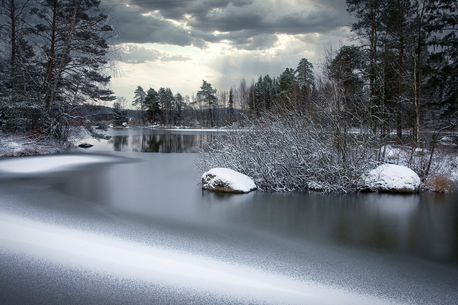 Dark November day on the lake. Just rained snow adorns the landscape.