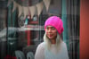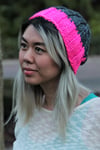The beanie style uses roughly 65yds, while the slouchy version uses roughly 90yds. That means that two skeins of Home will make two beanie style hats and one slouchy style hat. Pictures featured show the Fluoro Rose colorway in slouchy, Fog colorway in beanie, and the colorblock version in beanie style.