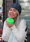The ribbing allows for a lot of stretch, and so, while the hat is only 12” in circumference, it will stretch and fit comfortably up to a 23” head circumference. The model has a 20” circumference head.