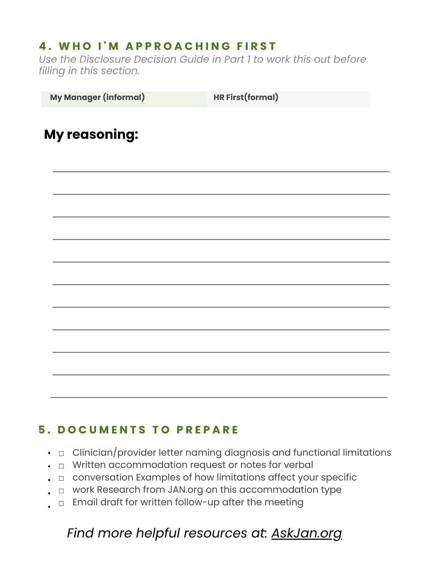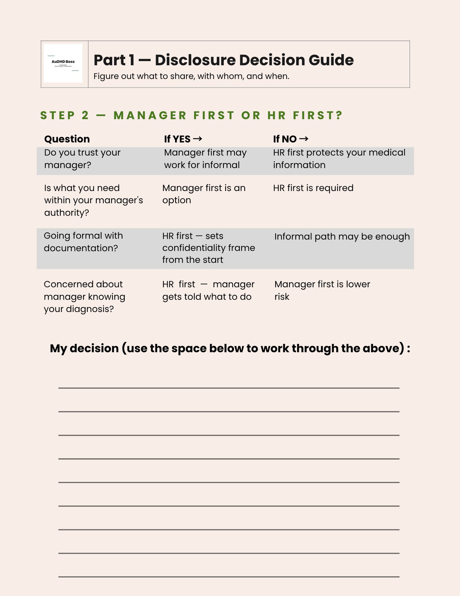 Part 1 — Disclosure Decision Guide Disclosure isn't one decision. It's a series of decisions, and you have more control over some of them than others. This guide walks you through whether to go formal or informal, whether to approach your manager or HR first, what to say in each scenario, and what to document throughout the process. Includes AuDHD-specific functional language examples grounded in limitations documented by the Job Accommodation Network (JAN).