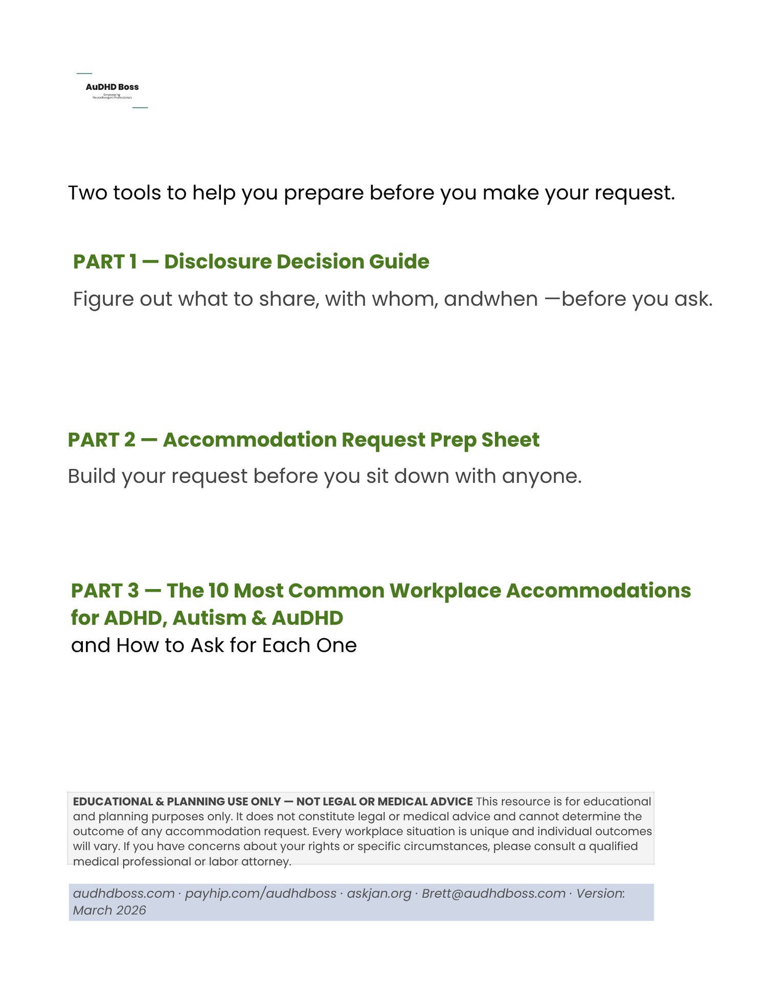 Part 2 — Accommodation Request Prep Sheet A fillable worksheet to complete before the conversation. Covers what you're requesting, the functional limitation it addresses, why the accommodation fits, who you're approaching first, documents to prepare, and key phrases to practice out loud before you go in.