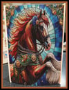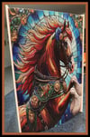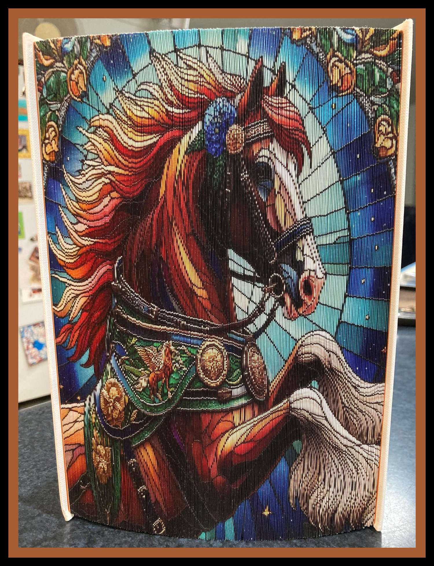 Create a powerful and elegant piece of book art with this Majestic Horse digital book folding pattern. This detailed design captures the strength and beauty of a noble stallion, featuring flowing mane details, ornamental tack accents, and a radiant stained-glass style background that creates a dramatic finished effect.