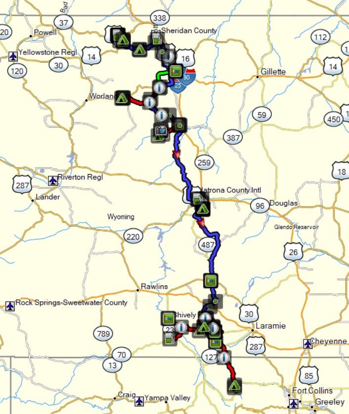 .GPX track files (an open source file) to ride a motorcycle (big bike friendly dirt roads) or drive (Jeep roads) north/south from northern Wyoming / Big Horns / Bear Lodge (basecamp) to southern Wyoming / Centennial (basecamp)