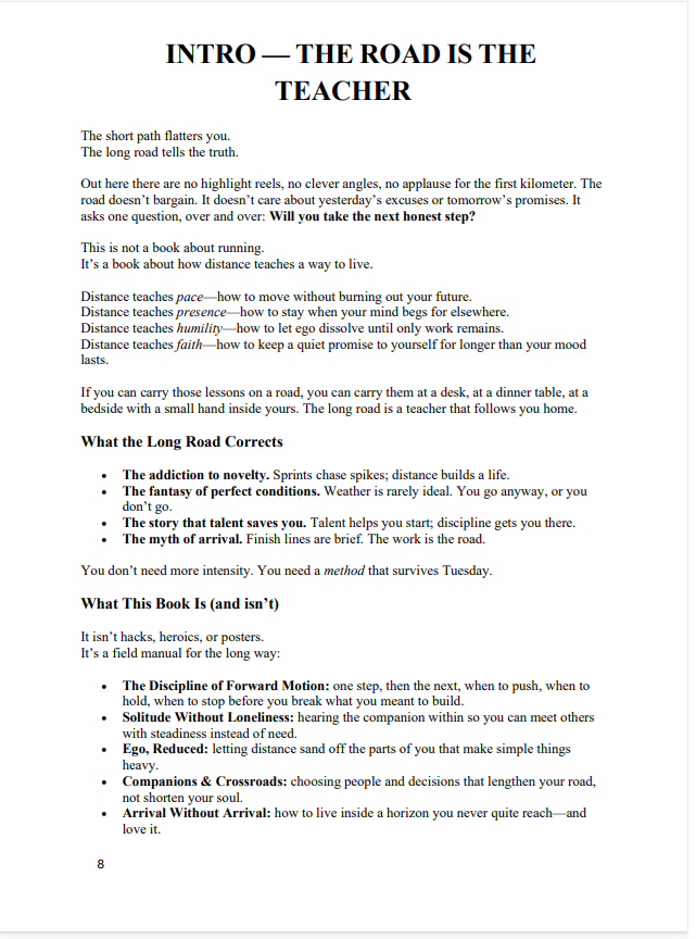 A field manual for distance as a way of life. Trade speed spikes for repeatable pace, build momentum with short loops, keep form when you’re tired, and choose companions and crossroads that lengthen your road. No fluff—moves that survive Tuesdays.
