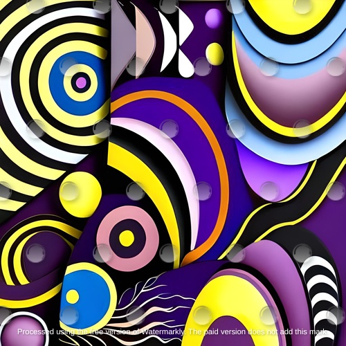 Purple, black, yellow, and white abstract of geometric shapes and lines.