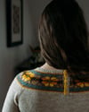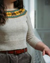 She was drawn to a bold short-sleeved jumper from the 1950s by Shetlander Harriet Stout. It featured a Fair Isle panel and a back button band. Ella incorporated elements of it into a Fair Isle yoke, but made sure to centre the motifs so it can be worn either way.