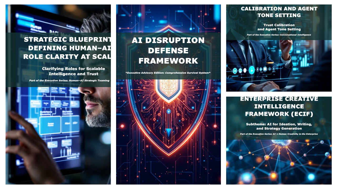 This high-impact executive bundle guides leadership teams through a strategic journey: defending against disruption, defining new roles, building conversational trust, and unlocking scalable creativity. It’s built for those tasked with evolving their organizations without losing their human edge.