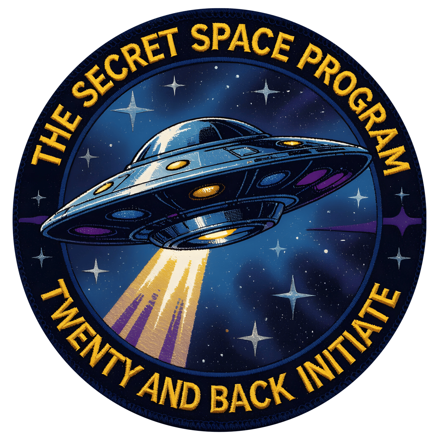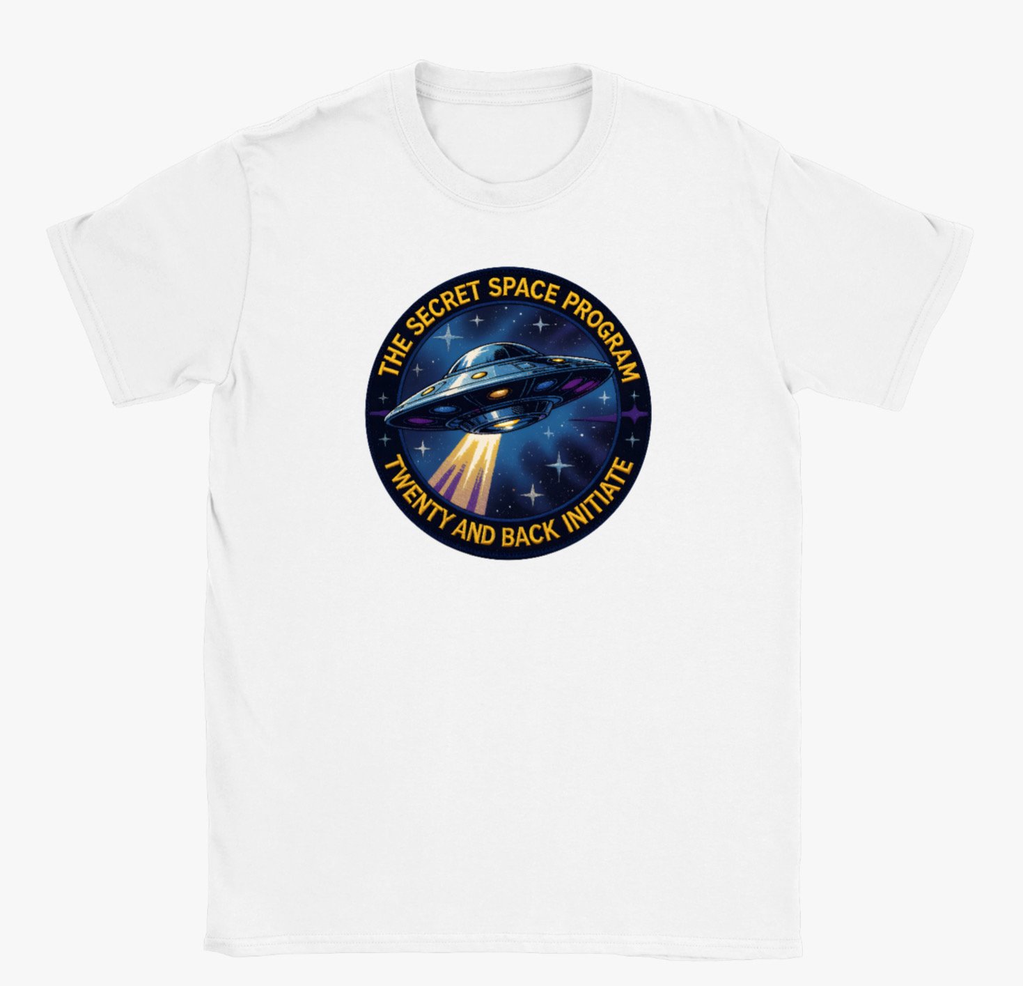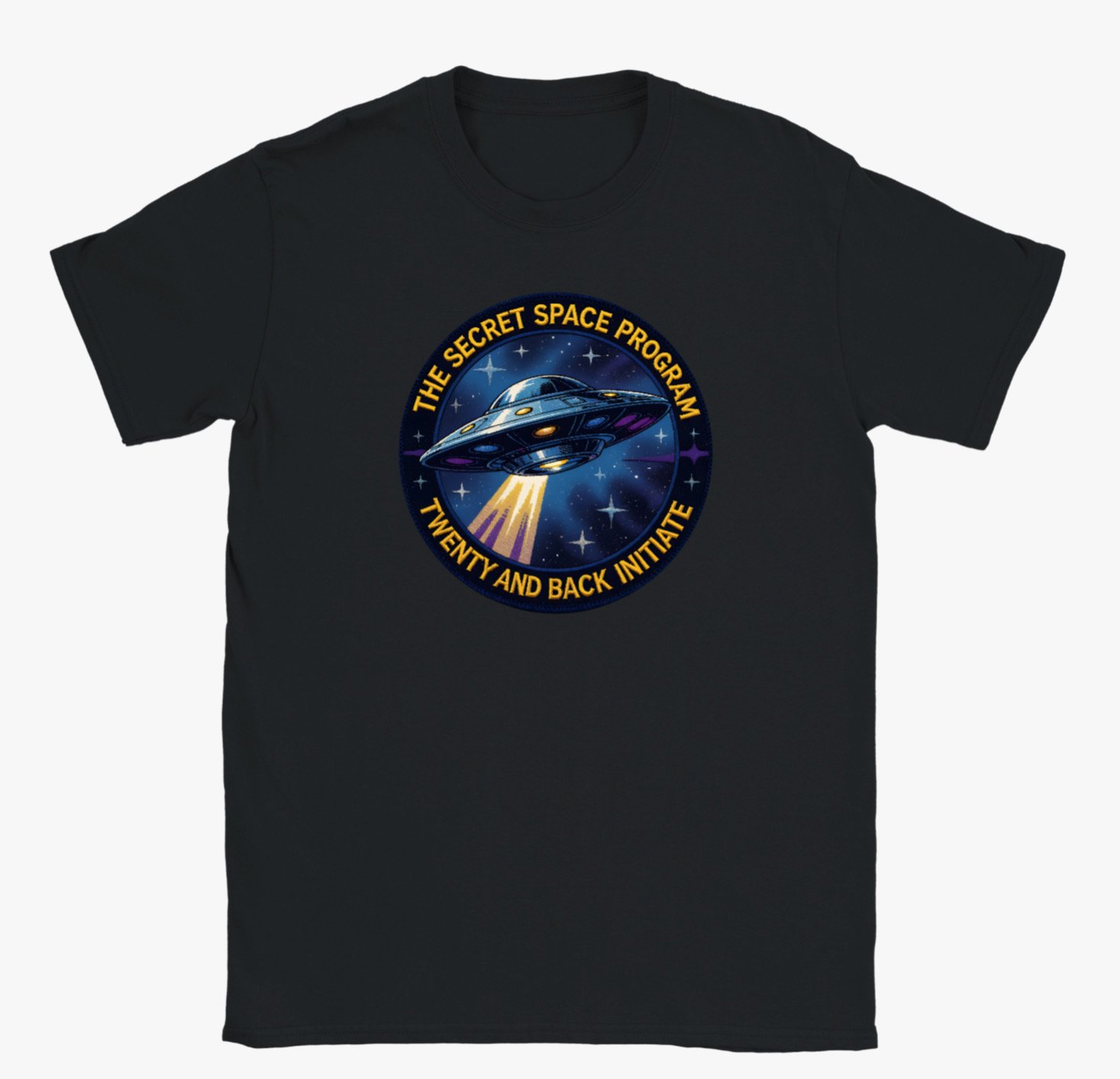 Step into the unknown with this bold secret space program t-shirt. Featuring a vibrant, retro-inspired UFO emblem surrounded by the words ”The Secret Space Program- Twenty and Back Initiate,” this design celebrates mystery, adventure, and the spirit of cosmic exploration.