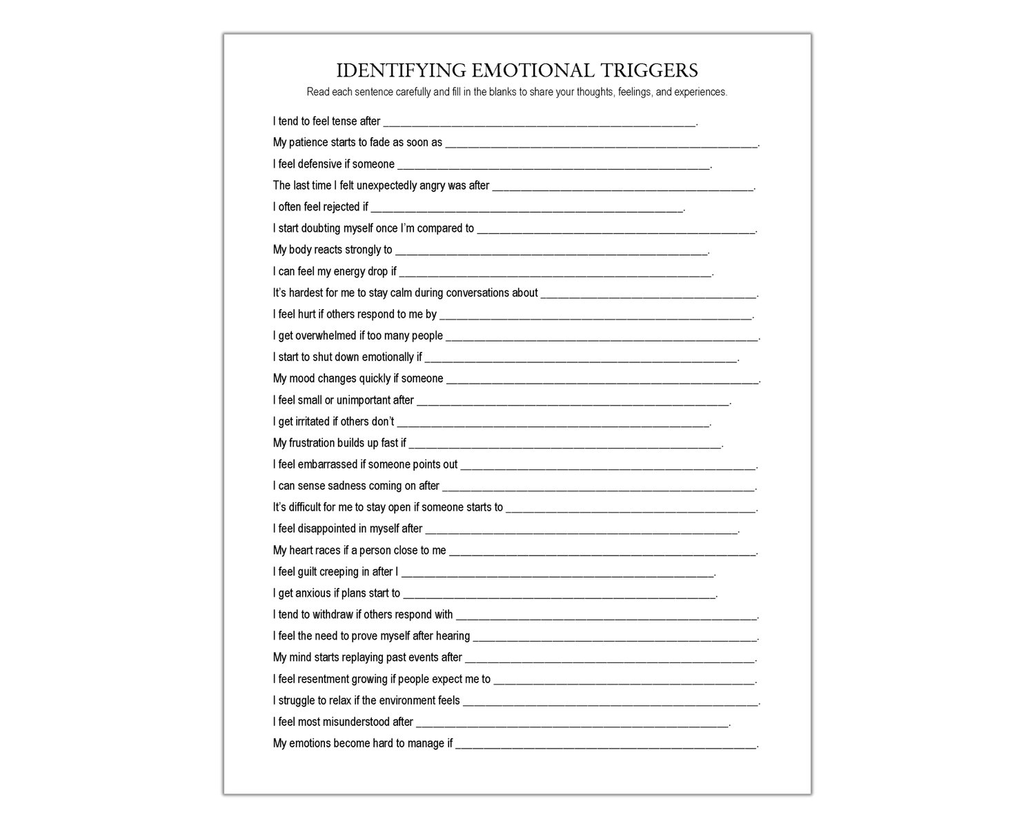 Take a moment to explore what influences your emotions and responses with this Identifying Emotional Triggers worksheet. This resource features 30 prompts that guide you to reflect on your reactions and recognize patterns over time. Build awareness and emotional balance at a pace that feels right for you. Reflect, learn, and grow while connecting with your feelings in a safe, supportive way.