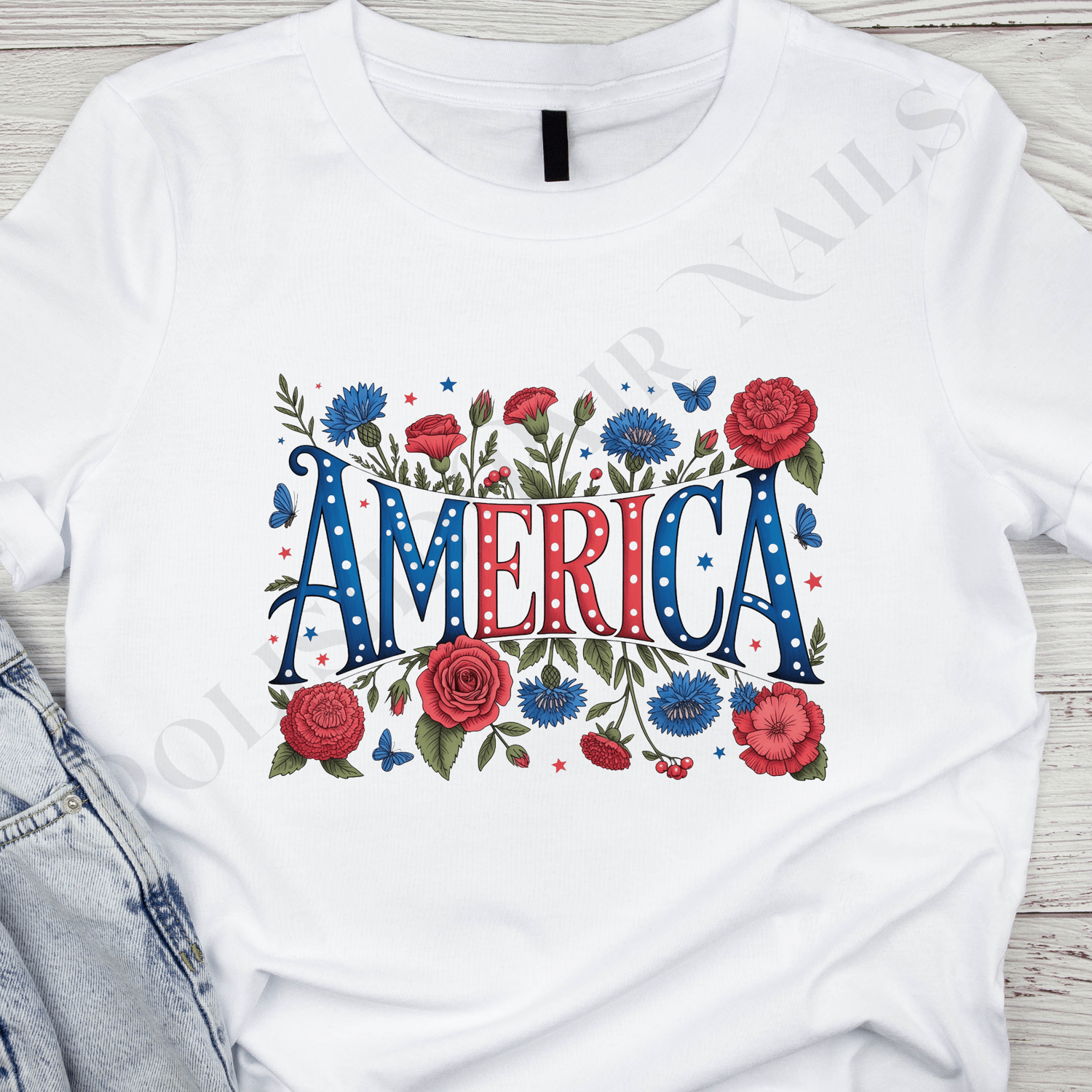 Show your patriotic spirit with this vibrant 'America Floral' t-shirt! The word 'AMERICA' is beautifully rendered in a mix of red, white, and blue, surrounded by festive red and blue flowers, stars, and tiny butterflies.