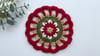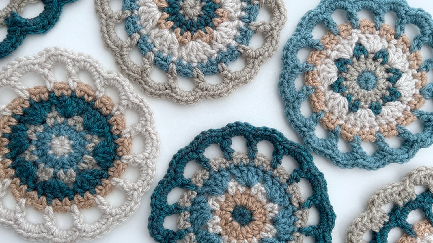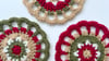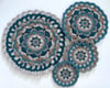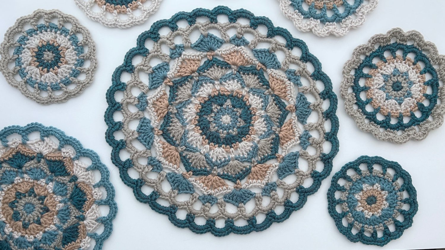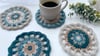 All four patterns are included in this PDF crocheted mandala set. Items and their sizes are as follows.