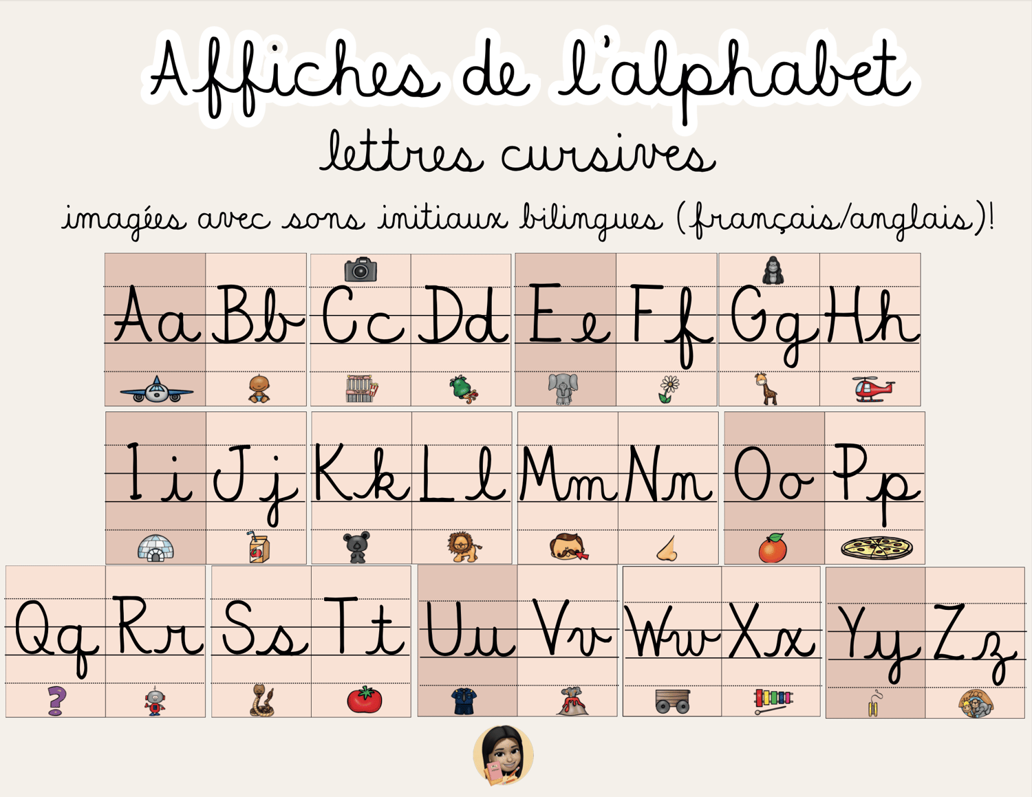 Affiches de l'alphabet (lettres cursives) imagées avec sons initiaux bilingues (français/anglais)