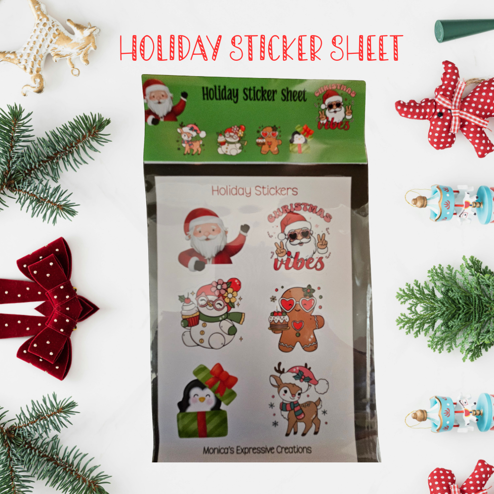 Bring festive fun to your holidays with these adorable Holiday Sticker Sheets, perfect for kids and adults who love to decorate, create, and add a touch of cheer! Each set comes beautifully packaged with a themed topper and sealed in a clear cellophane bag, making it gift-ready and perfect for stocking stuffers.