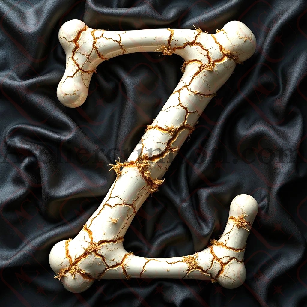The letter Z Bones with gold fissures A hauntingly beautiful character crafted from pristine human femur bones, intricately arranged to form a bold, serif typeface. Delicate golden fissures, reminiscent of kintsugi art, weave through the ivory-white osseous structure, adding an element of elegant repair. The character stands proudly on a luxurious marbled floor, its form casting subtle shadows. Behind it, a textured black linen backdrop provides a striking contrast, emphasizing the letter's ethereal beauty.