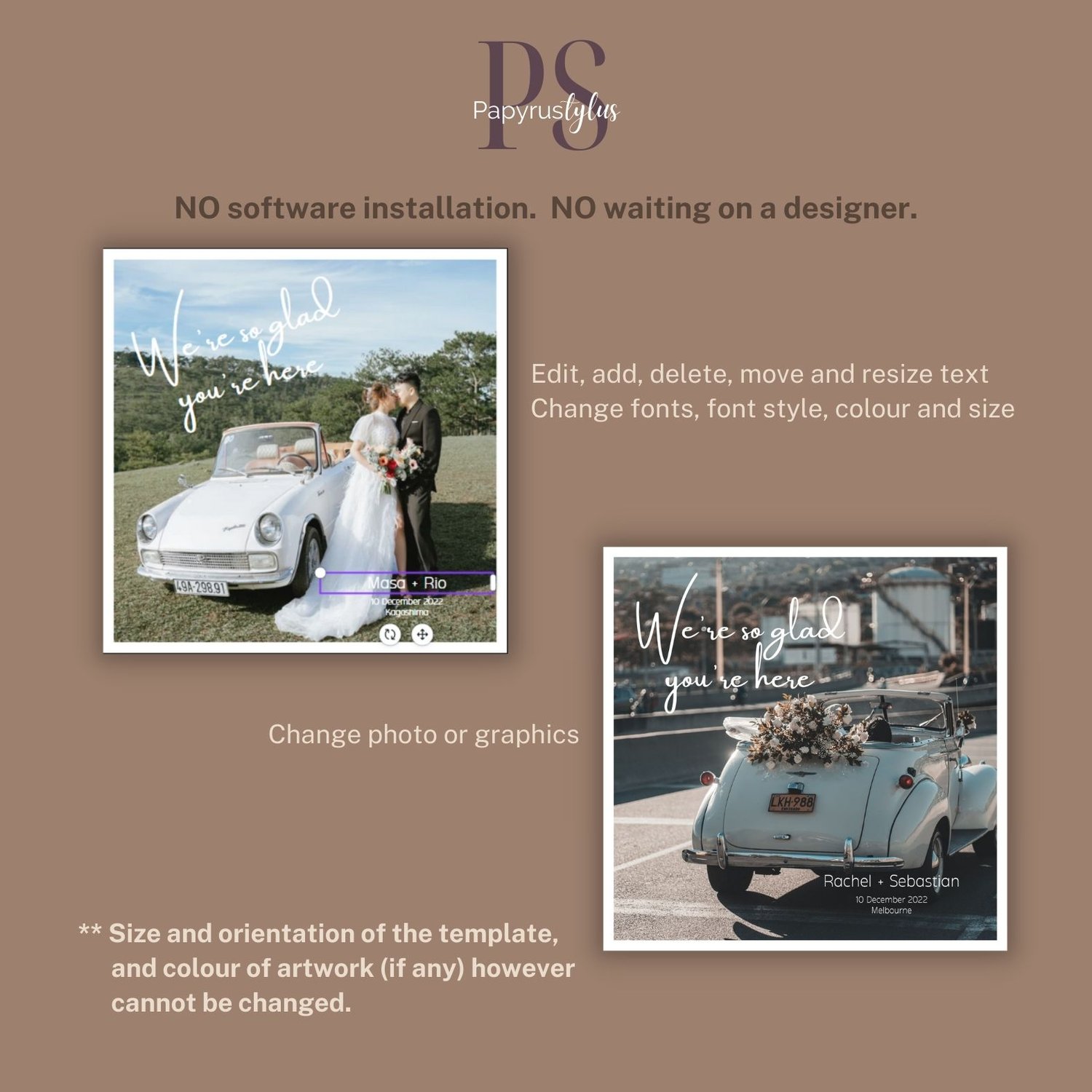 One-page welcome sign template, customisable in Canva:Size: 508 x 508 mm (20 x 20 in)