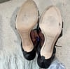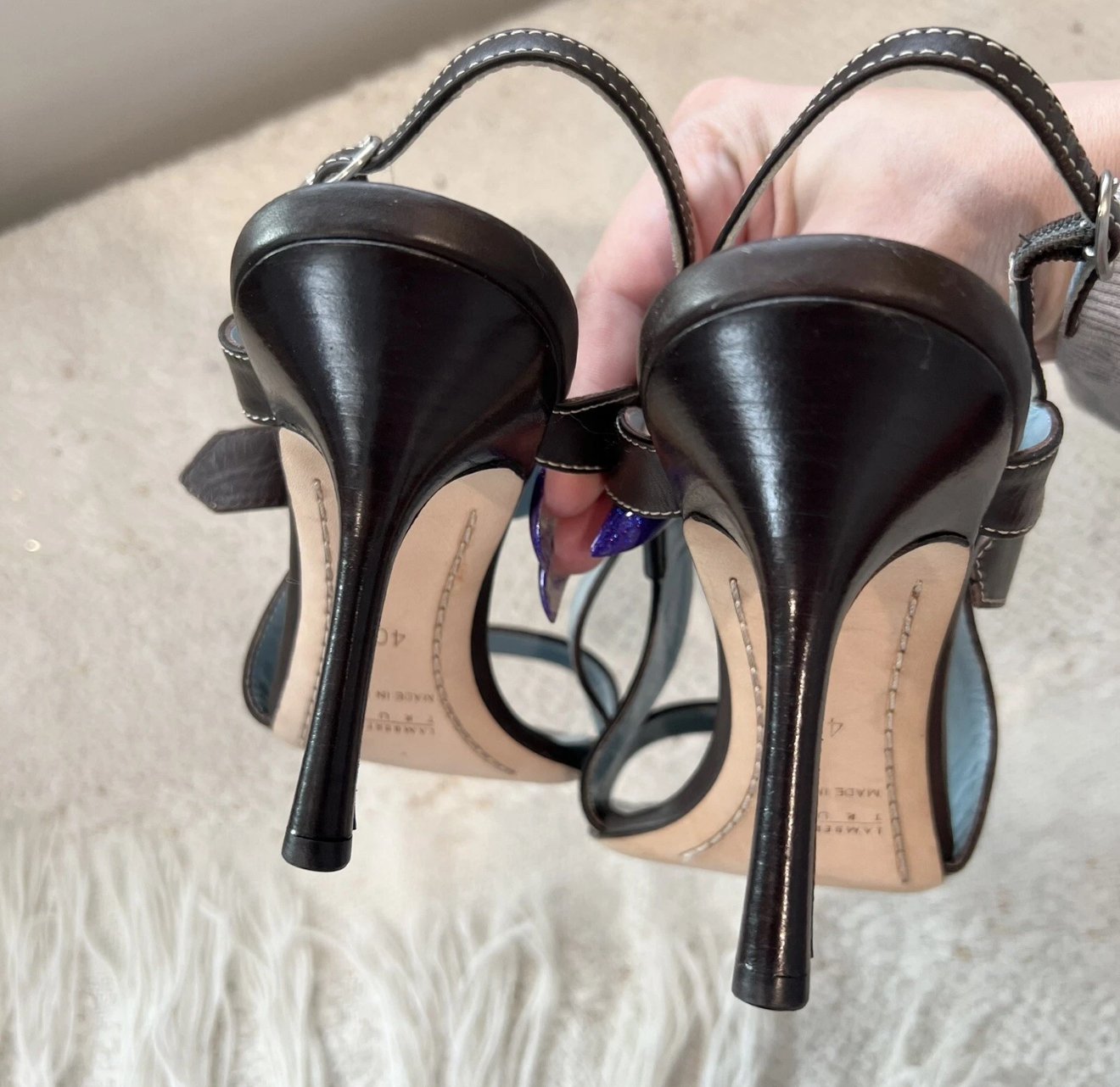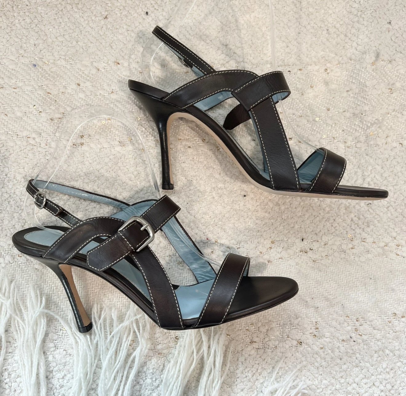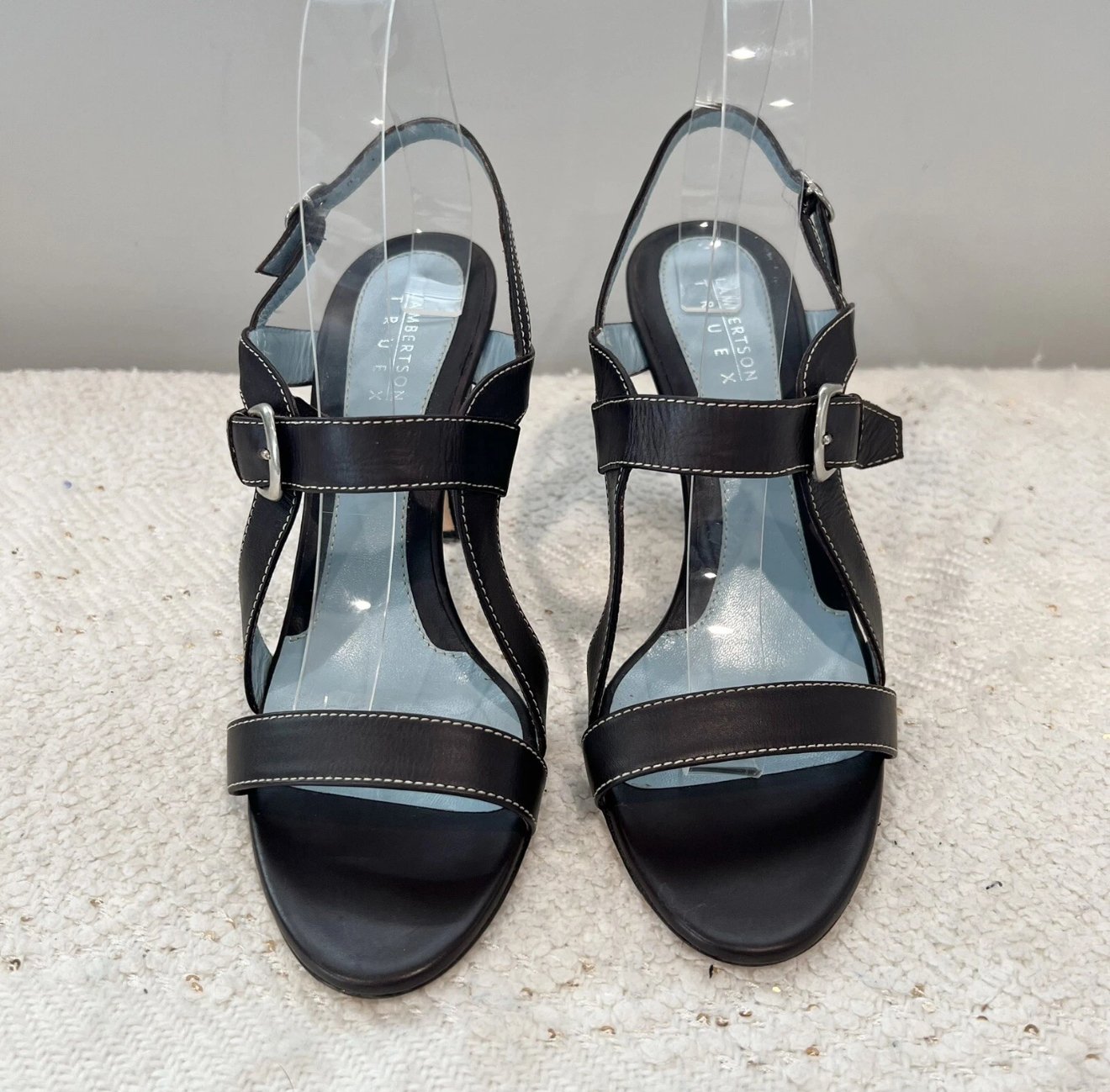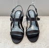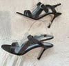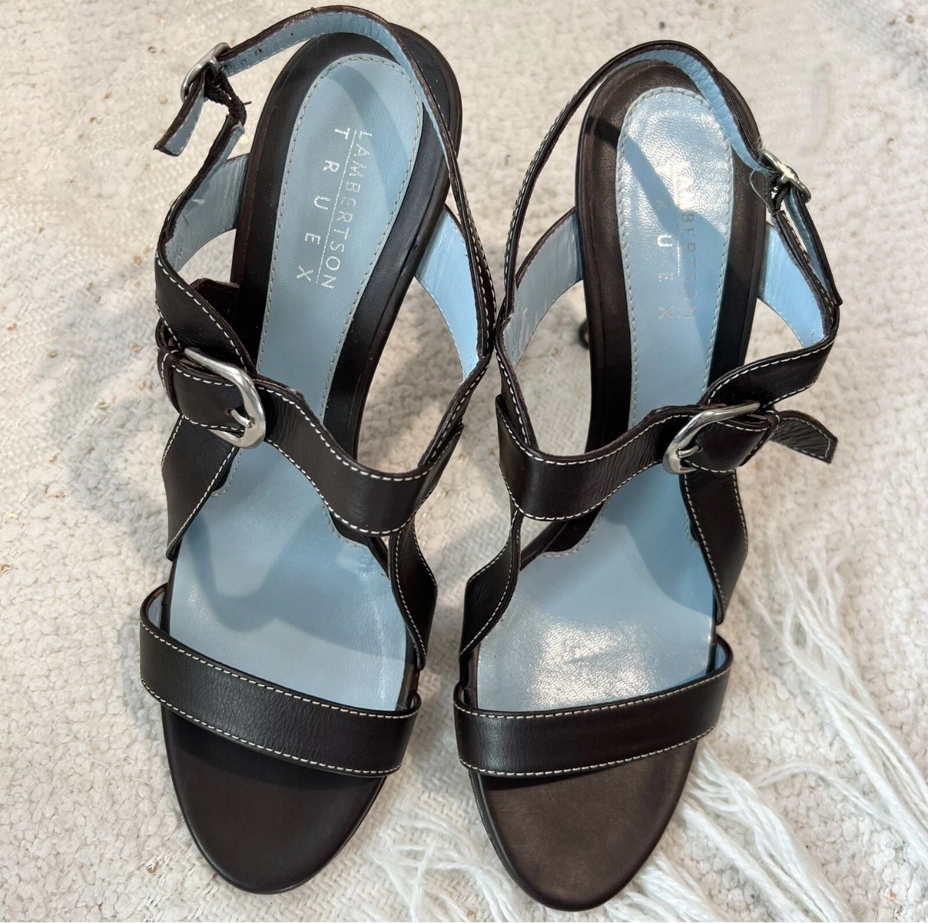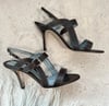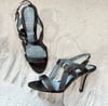 Lambertson Truex dark brown leather open toe sling back high heels with silver tone metal hardware and buckle closures.