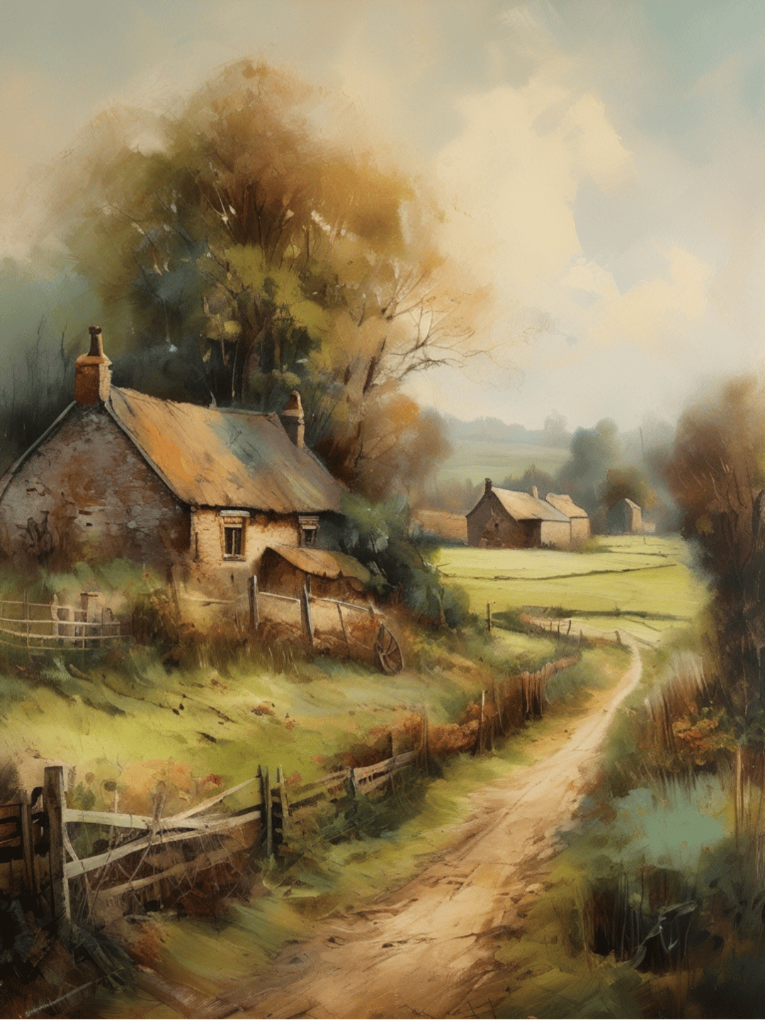 The old British countryside, a work of wall art dating back to 1960, with all its details and colours. The farm is an old oil painting in faded oil colours.png