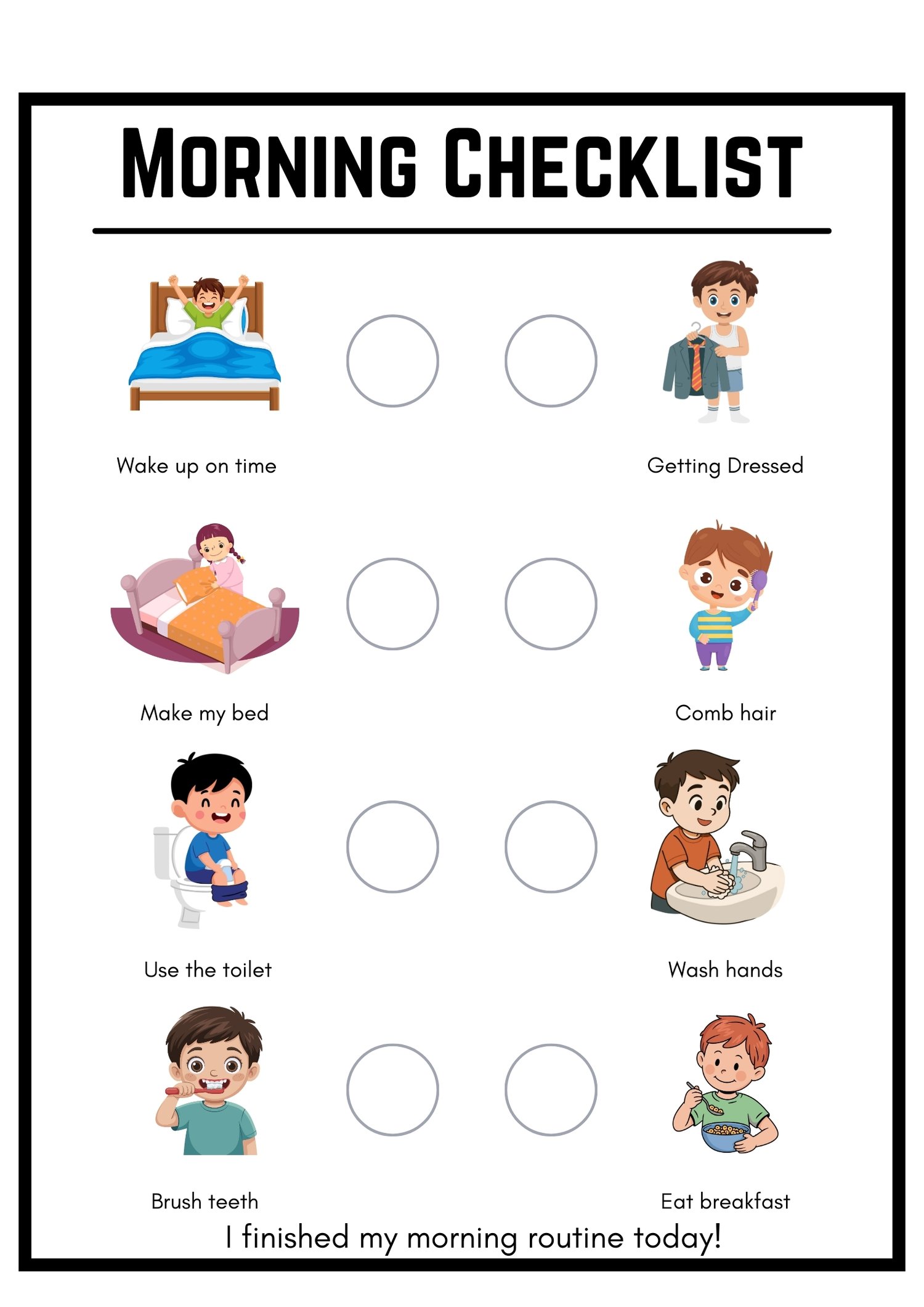 📋 Page 1: Morning Checklist – Start the day right with wake-up, hygiene, and breakfast routines