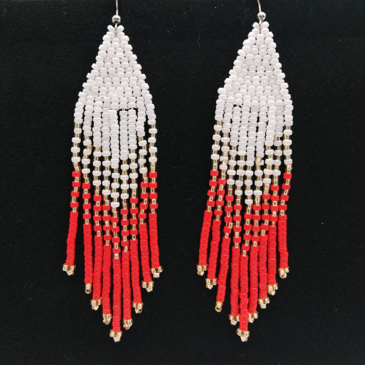Acești cercei handmade sunt creații unice, atent lucrate din margele fine de nisip, oferindu-le un aspect distinct și elegant. Designul lor imbină armonios nuanțe de alb, auriu și rosu, creand astfel o paletă vibrantă și eleganta. Cerceii sunt susținuți de tortițe argintii, adăugand un touch sofisticat și rafinat intregii piese. Cu această bijuterie, veți aduce cu siguranță un strop de culoare și originalitate oricărei ținute, subliniind stilul dumneavoastră distinct și aprecierea pentru creații handmade de calitate.