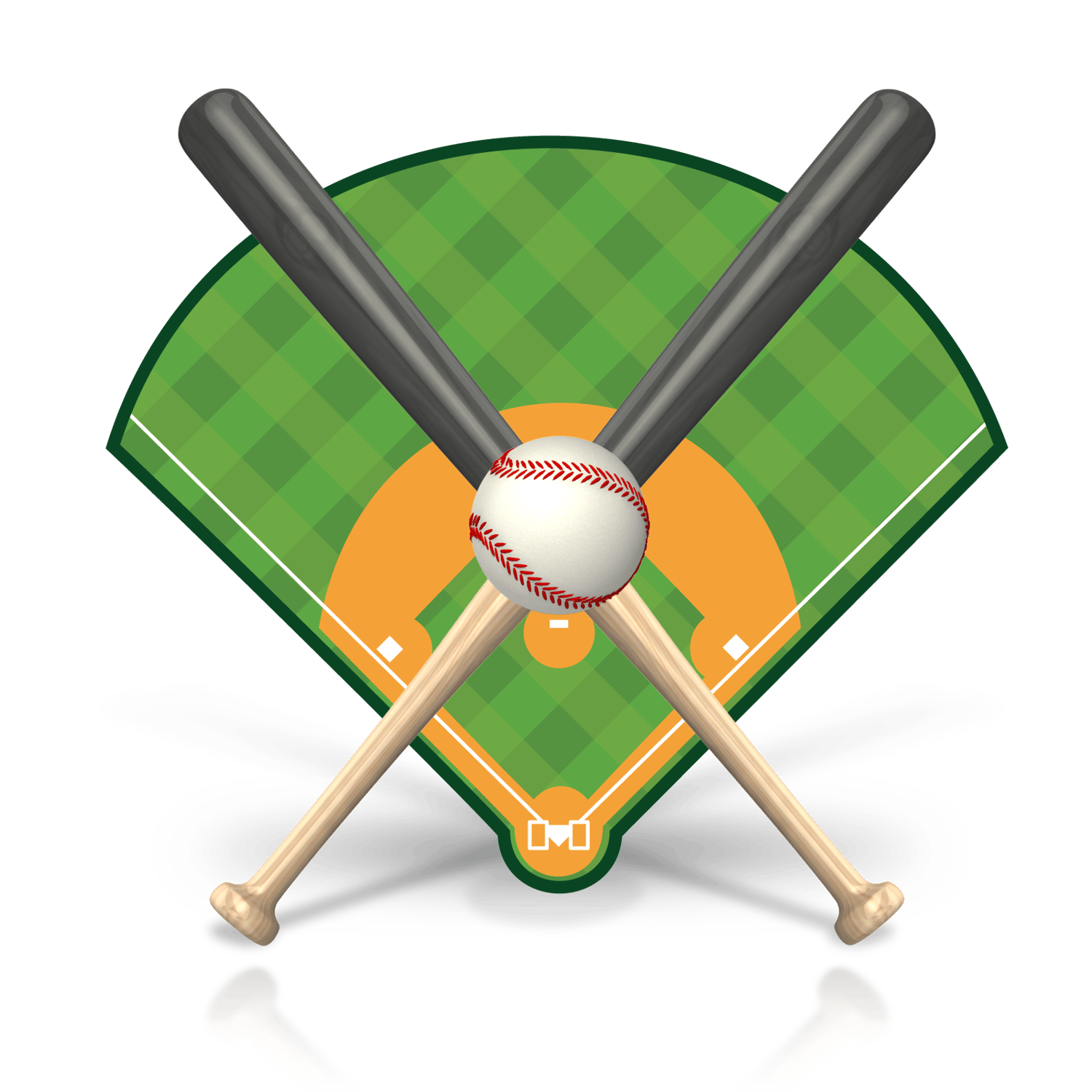 An image of a baseball field with a baseball and two bats.
