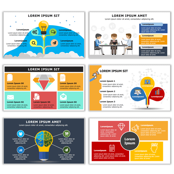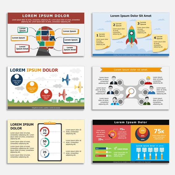 - Las plantillas con orientación horizontal tienen 6 versiones de colores. (azul, naranja-amarillo, verde, rojo, 2 versiones de multicolores)
