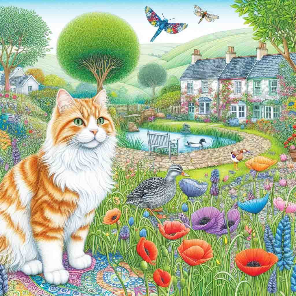 Ginger & white cat in a field of flowers, little cottages, a pond, ducks & butterflies.