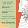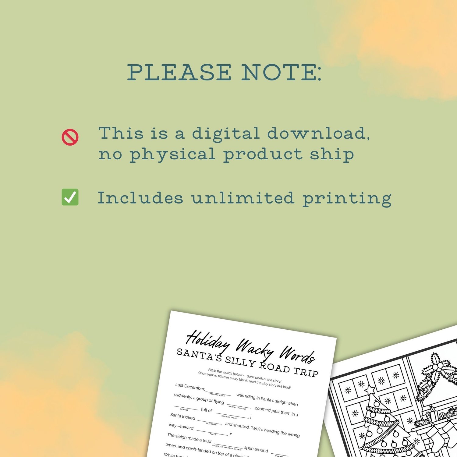 From Holiday Travel Bingo and a Scavenger Hunt to Wacky Word Tales (our friendly twist on Mad Libs), Would You Rather? question sets, and coloring pages, this bundle is merry, bright, and full of giggles.