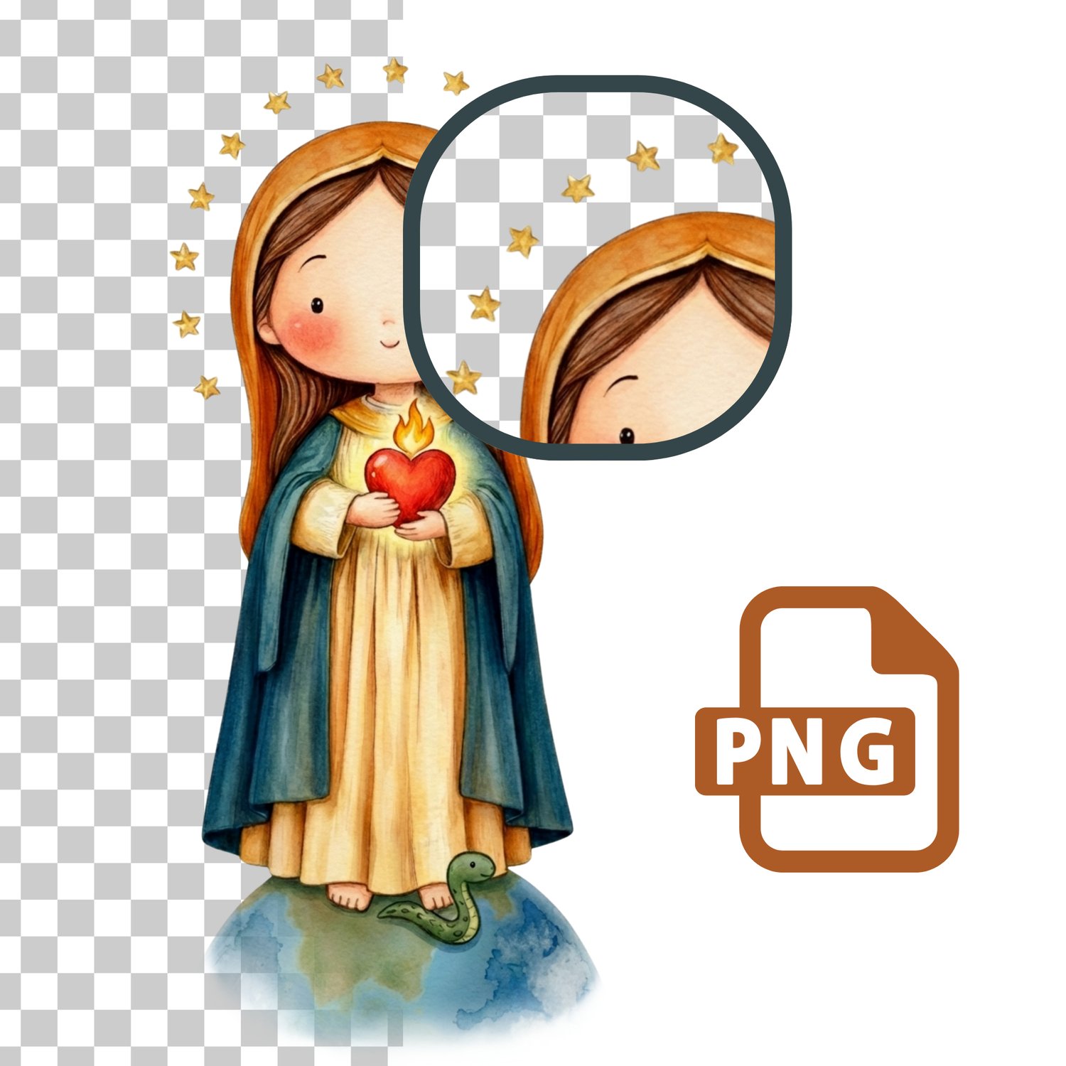 Virgen de la Llama de Amor PNG Acuarela - Kit de Clipart Religioso Infantil - Ilustración para Bautizo, Comunión y Santitos - Descarga Digital