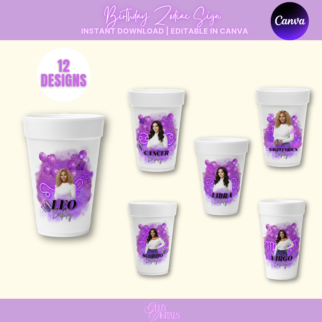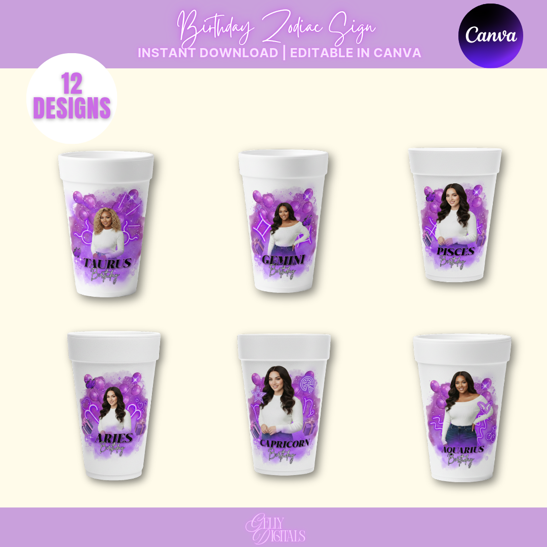 Make your birthday extra special with our Zodiac Sign Birthday Cups! 🌟 Featuring 12 unique designs, each cup is customized with your zodiac sign and a stylish purple balloon design. Perfect for adding a personal touch to your party, these Cups, T-Shirt etc. are easily editable in Canva for a fun DIY experience. Whether you're celebrating with friends or family, these cups will make your party one to remember. ✨
