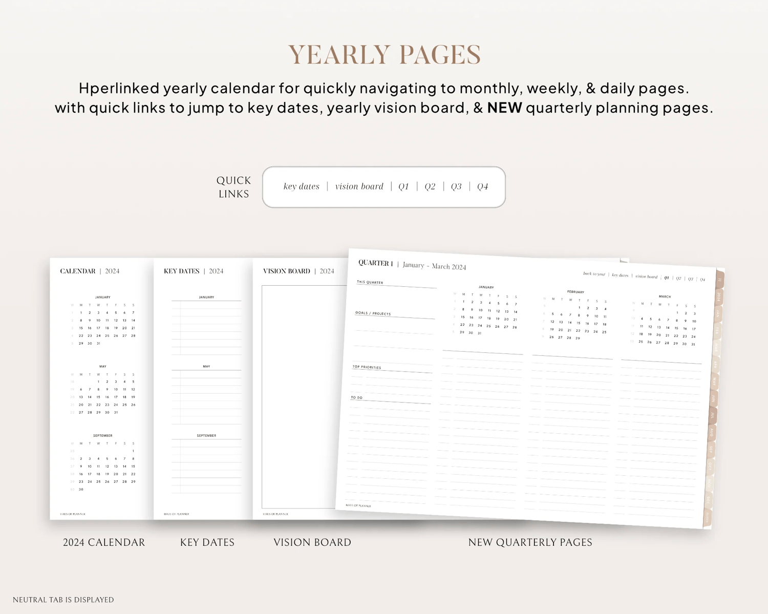 - Yearly vision board with quick links switch between yearly calendar, key dates, vision board, quarter planning page