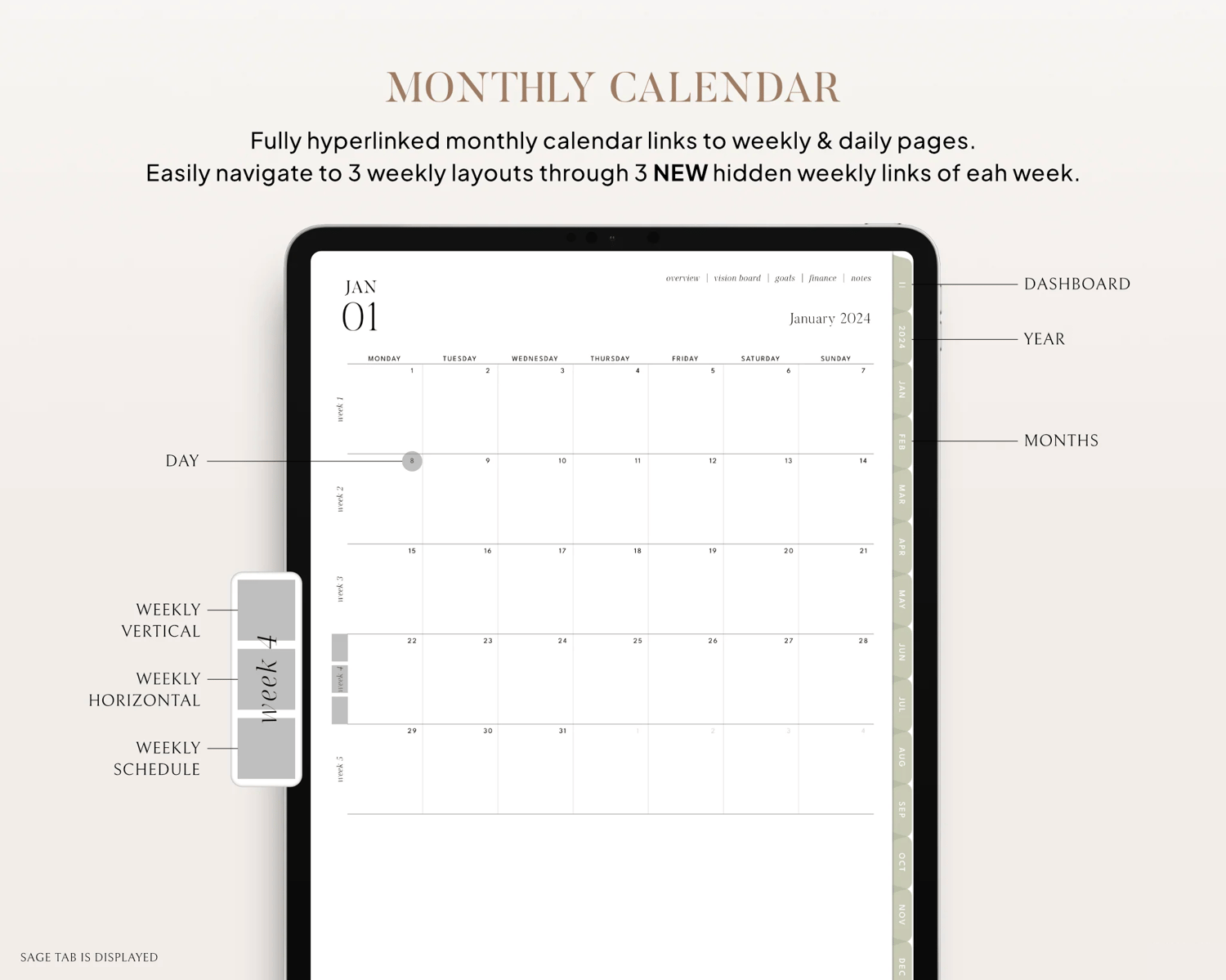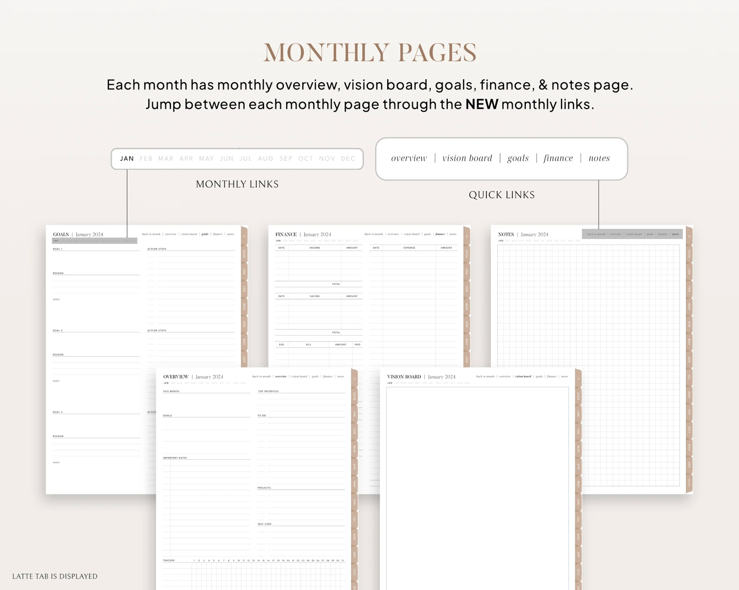 - 12 Monthly overviews, vision boards, NEW goals, finances, & notes with NEW 12 monthly links between each monthly page.