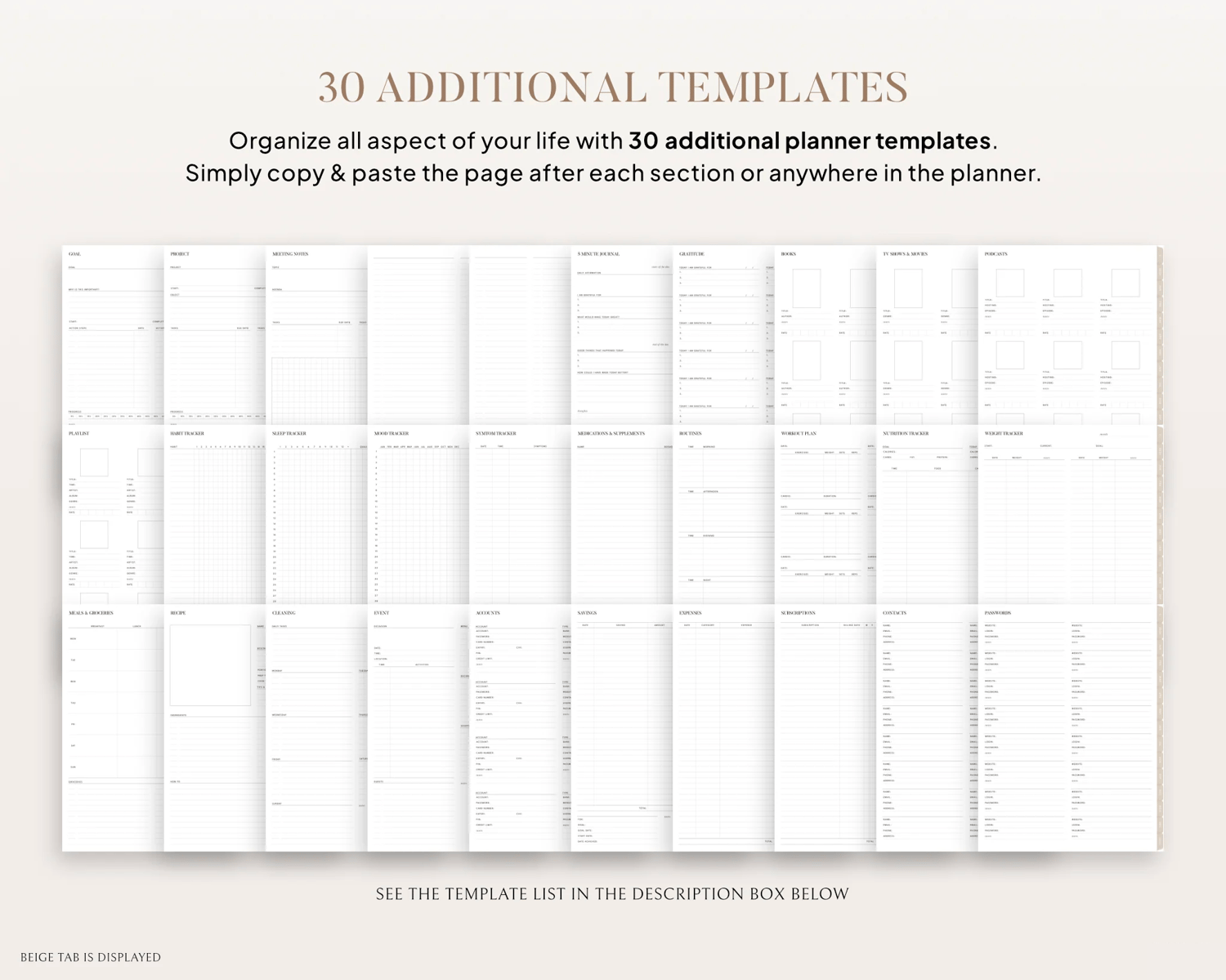 - 30 Additional life planning templates: NEW Goal planner, Project planner, NEW Meeting notes, Event planner, Master to do (& column), Reading list, TV show & Movie list, NEW Podcast list, Playlist, Contact list, Password tracker, 5 Minute journal, NEW Gratitude journal, Habit tracker, Sleep tracker, Mood tracker, Symptom tracker, Medication & Supplement tracker, Routine planner, Workout planner, NEW Nutrition tracker, NEW Weight tracker, Meal planner & Grocery list, Recipe card, NEW Cleaning planner, NEW Account tracker, NEW Saving tracker, NEW expense tracker, & Subscription tracker.